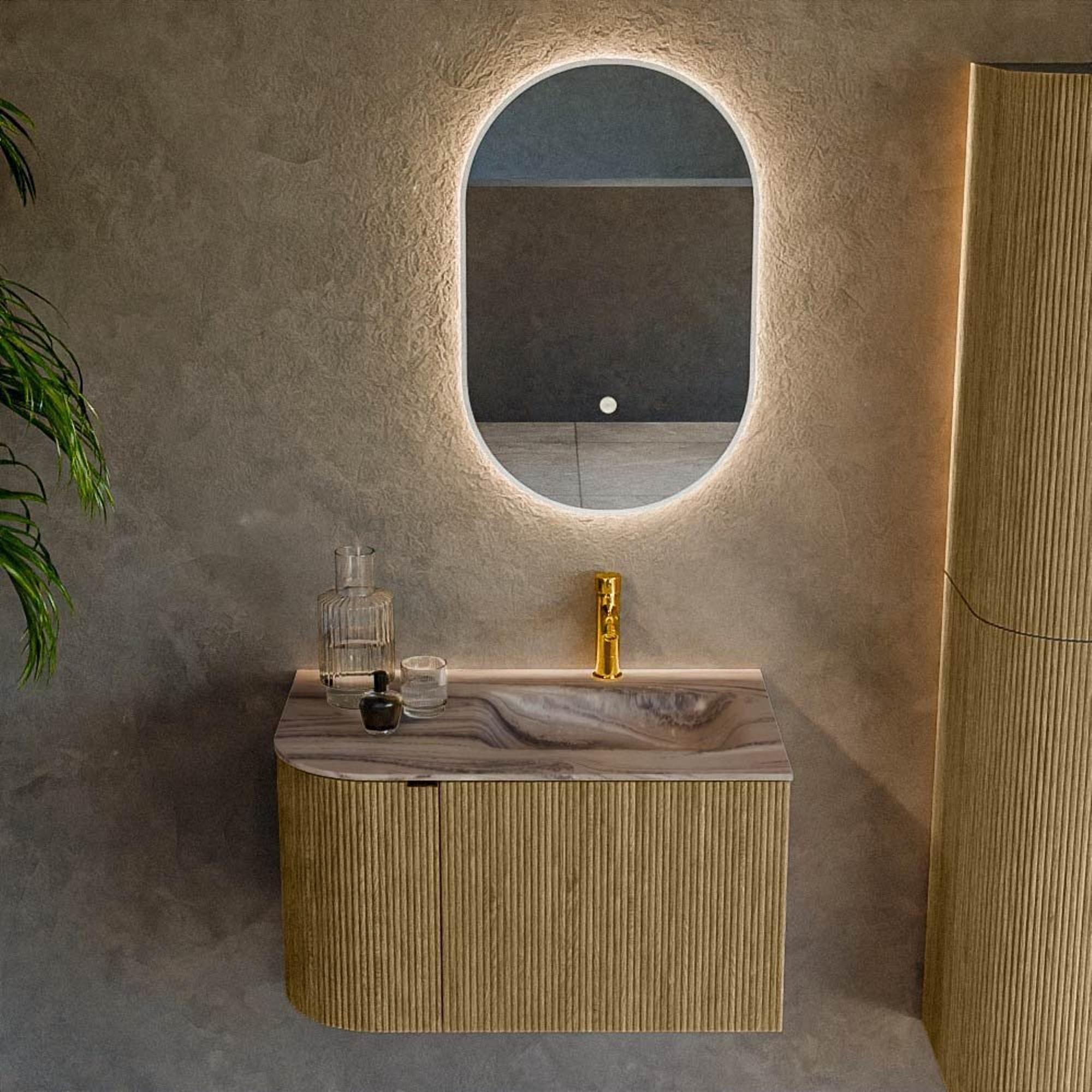MONDIAZ KURVE-DLUX 75cm badmeubel ronding Links kleur Dusk met 1 lade en 1 deur. Wastafel GRUNNE Rechts 1 kraangat Sombra.