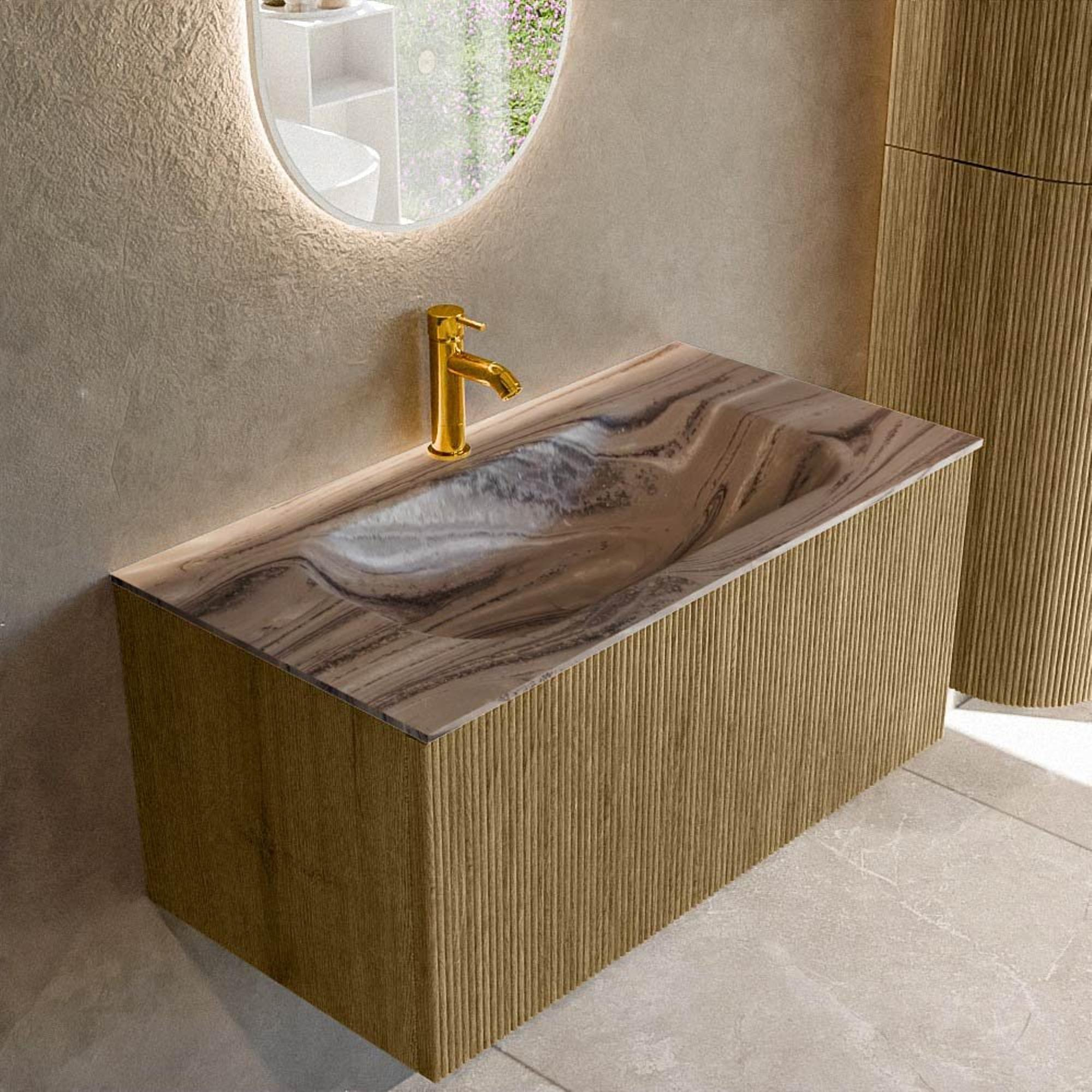 La couleur chaude Dusk combinée à la façade à nervures verticales donne au meuble une apparence raffinée, presque comme une véritable pièce de mobilier. Grâce à la structure bois marquée et à la composition en lattes verticales, un beau jeu de lumière et d'ombre se crée, donnant immédiatement plus de profondeur et d'ambiance à votre salle de bains. Cela rend le meuble particulièrement adapté à ceux qui souhaitent créer un look naturel mais néanmoins moderne, par exemple en combinaison avec de doux tons terreux, des robinets noirs ou des carreaux effet béton. Comme la façade et le caisson appartiennent à la même famille de couleurs, l'ensemble paraît calme et harmonieux. Le résultat : un point central élégant dans votre salle de bains qui restera contemporain même après des années.