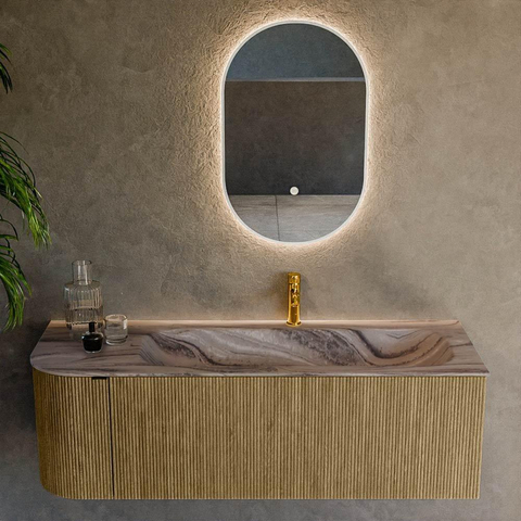 La couleur Dusk et la façade rainurée verticale confèrent à ce meuble une apparence luxueuse et contemporaine, comme si vous entriez dans un hôtel design. Le décor bois apporte de la chaleur à la pièce et se combine aisément avec des carreaux effet béton, du marbre, des accents noir mat ou au contraire un chrome intemporel. Les façades sans poignées avec système push-to-open renforcent le jeu de lignes épurées et font en sorte que le meuble paraisse calme, même dans les petites salles de bains. Grâce aux angles arrondis, l’ensemble s’harmonise parfaitement avec les formes douces et organiques du reste de votre intérieur, comme un miroir rond ou une baignoire îlot, tandis que la forme de base rectangulaire assure tout de même un tracé moderne et rectiligne.