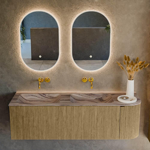 La combinaison du côté droit arrondi et de la façade nervurée avec structure verticale confère à ce meuble un caractère doux et architectural. La couleur Dusk a l’apparence d’un bois de haute qualité et apporte de la chaleur dans votre salle de bains, sans paraître chargée ou agitée. Grâce aux angles arrondis, l’ensemble semble plus élancé qu’un meuble rectangulaire standard, tout en ne sacrifiant rien en termes d’espace de travail en largeur. Surtout dans les salles de bains où vous utilisez des carreaux épurés, du verre et du chrome, ce meuble crée un équilibre et une atmosphère accueillante. Le design intemporel se combine aisément avec des robinets noirs, en inox ou chromés, ce qui vous permet d’adapter facilement le style de votre salle de bains à l’avenir.