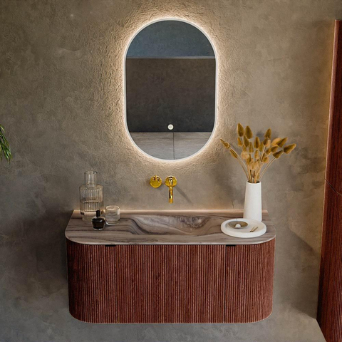 La forme arrondie à la fois du côté gauche et du côté droit confère à ce meuble un look fluide, presque digne d'un hôtel. Pas de lignes dures, mais des courbes douces qui donnent immédiatement à votre salle de bains un caractère plus calme et plus accueillant. La couleur Ruby du meuble offre un look affirmé mais pourtant chic : un rouge chaud avec une touche moderne, magnifique à combiner avec des carreaux neutres, des accents noirs ou du métal brossé. Les façades avec effet nervuré vertical (façade 3D) apportent une profondeur et une texture supplémentaires, de sorte que le meuble paraisse toujours luxueux et particulier, même dans une salle de bains par ailleurs sobre. Vous ne choisissez donc pas simplement un meuble sous-vasque, mais une véritable pièce maîtresse qui donne à votre salle de bains un caractère personnel et haut de gamme.
