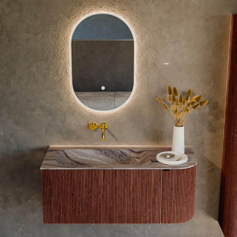L’élégant arrondi sur le côté droit donne à ce meuble de salle de bains une allure douce et organique qui s’accorde parfaitement aussi bien avec les salles de bains modernes qu’avec les ambiances plus hôtel-chic. La couleur Ruby du meuble est chaleureuse et affirmée, ce qui crée un élément mural luxueux sans que l’ensemble paraisse chargé. La forme de base rectangulaire avec coins arrondis offre un silhouette épuré mais chaleureux qui se marie bien avec des miroirs ronds, des robinets noirs ou au contraire des accessoires minimalistes. Comme le lavabo est placé à gauche et l’arrondi à droite, il se crée un léger décalage en profondeur, ce qui agrandit visuellement l’espace et le rend plus dynamique. Vous obtenez ainsi un meuble qui n’est pas seulement pratique, mais qui apporte réellement quelque chose à l’ambiance.
