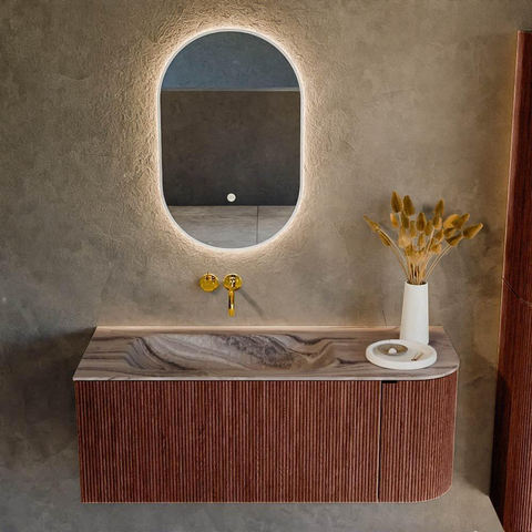 MONDIAZ KURVE-DLUX 115cm badmeubel ronding Rechts kleur Ruby met 1 lade en 1 deur. Wastafel BIG SMALL Links zonder kraangat Sombra.