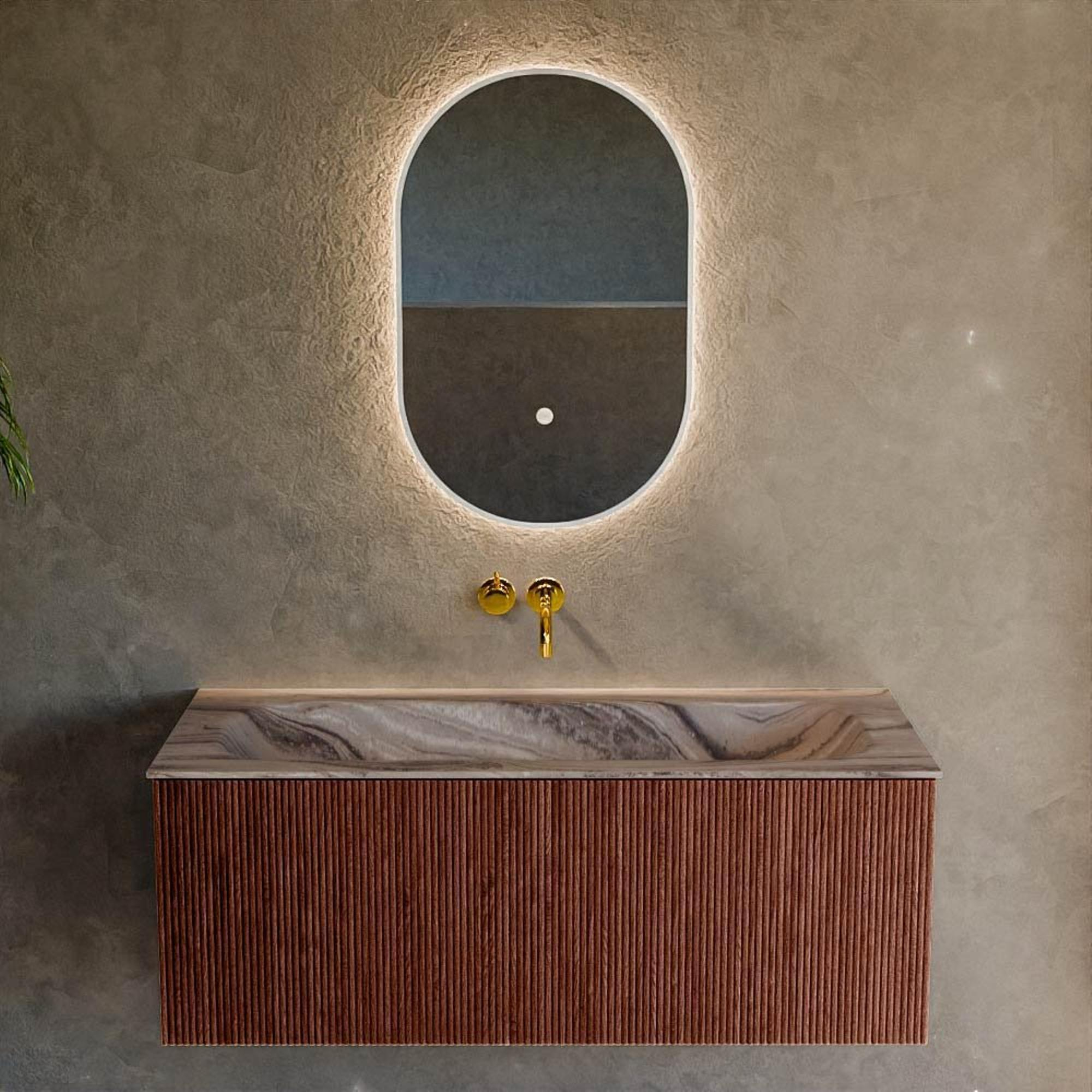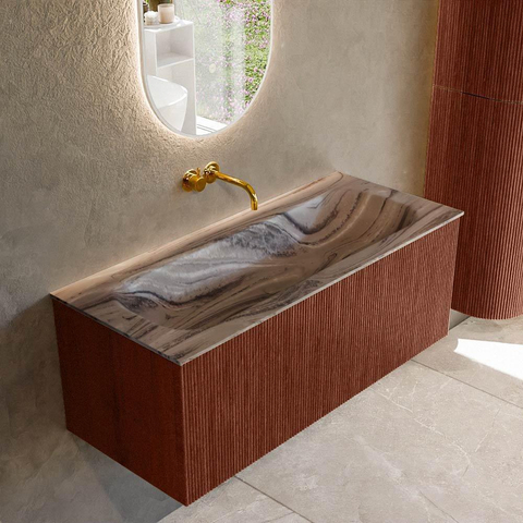 Avec ce meuble de salle de bains élégant, vous faites entrer chez vous un véritable accroche-regard qui s’intègre parfaitement dans une salle de bains moderne et axée sur le design. La chaleureuse couleur Ruby apporte immédiatement ambiance et caractère, tandis que les lignes droites et épurées créent au contraire de la sérénité et une impression d’ordre. Grâce à sa largeur généreuse, ce meuble est idéal pour les salles de bains de taille moyenne à grande, par exemple lorsque vous recherchez un lavabo confortable avec un espace de dépose supplémentaire, sans pour autant sacrifier l’espace de circulation. Le plan-vasque intégré avec grande cuve au centre et sans trou de robinet offre une totale liberté pour choisir vous-même un mitigeur mural ou sur plage assorti, ce qui vous permet de définir votre propre style jusque dans les moindres détails. Le tiroir spacieux permet en même temps de garder vos accessoires de salle de bains du quotidien bien hors de vue, afin que vous commenciez la journée dans un environnement ordonné et relaxant.