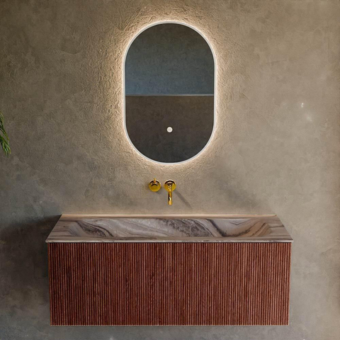 La teinte Ruby profonde fait de ce meuble de salle de bains un statement design subtil mais affirmé. Associée à la façade rainurée à structure verticale, elle crée une allure luxueuse digne d’un hôtel, qui se marie à merveille avec des carreaux neutres, une robinetterie noire ou au contraire des accents métalliques chaleureux. La forme rectangulaire et les lignes épurées assurent un ensemble au rendu moderne, tandis que la structure bois apporte simultanément chaleur et sensation de confort. Vous créez ainsi une salle de bains non seulement agréable à regarder, mais qui invite aussi à réellement se détendre. En optant pour un meuble coloré plutôt que pour un blanc standard, vous donnez immédiatement plus de personnalité à votre salle de bains et vous vous distinguez de la masse.