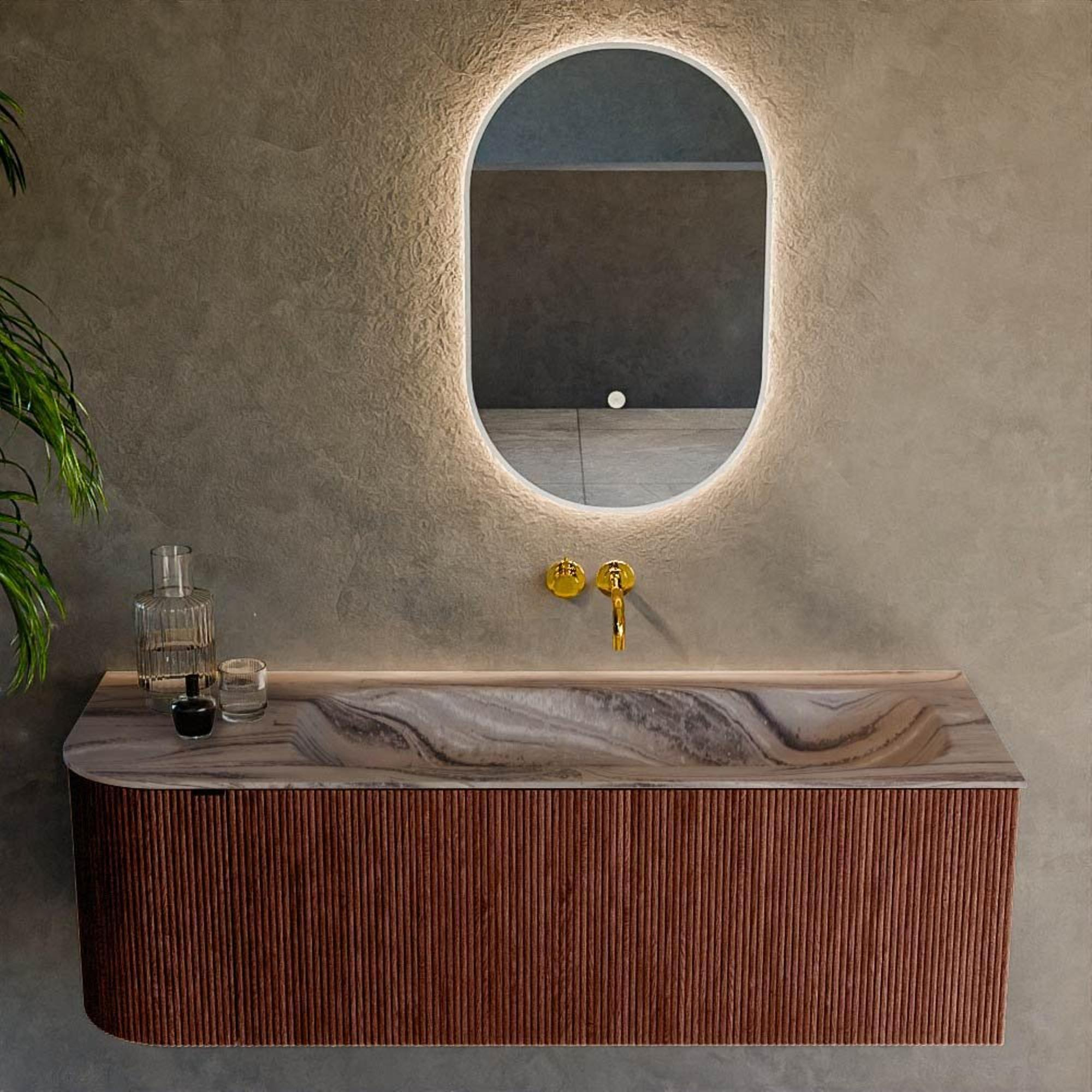 La couleur Ruby marquante donne immédiatement à votre salle de bains une apparence exclusive. La façade présente un profil à nervures verticales (façade 3D), ce qui confère au meuble de la profondeur et de la texture et lui donne cette petite touche de luxe supplémentaire. L'arrondi sur le côté gauche assure une ligne plus douce et rend souvent le passage dans la salle de bains un peu plus agréable, par exemple le long d'une paroi de douche ou près d'une niche. La forme du meuble est rectangulaire avec des coins arrondis, ce qui s'accorde parfaitement avec les salles de bains modernes aux lignes organiques. C'est un meuble qui ne disparaît pas en arrière-plan, mais qui fonctionne justement comme point central élégant et met joliment en valeur votre carrelage et vos accessoires.