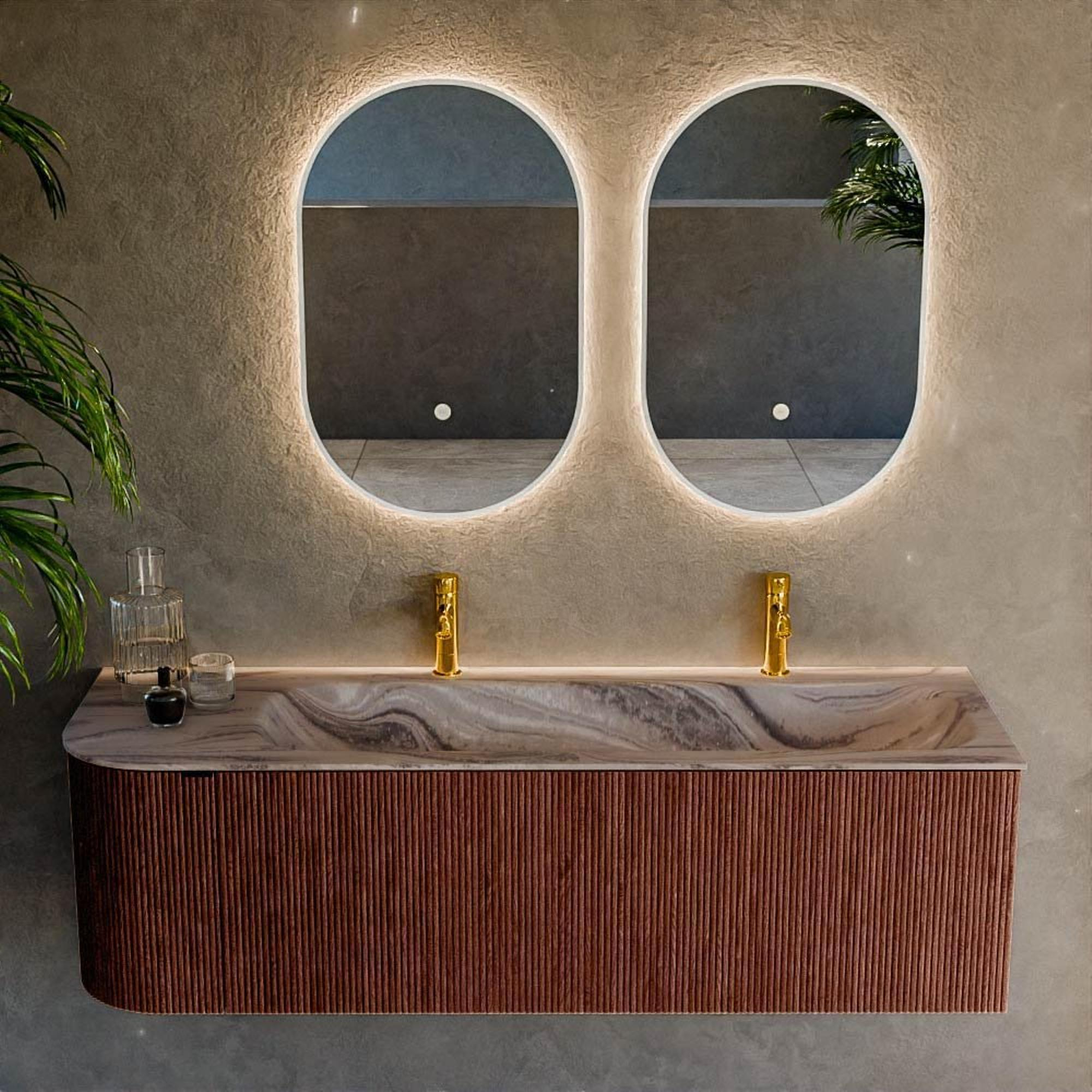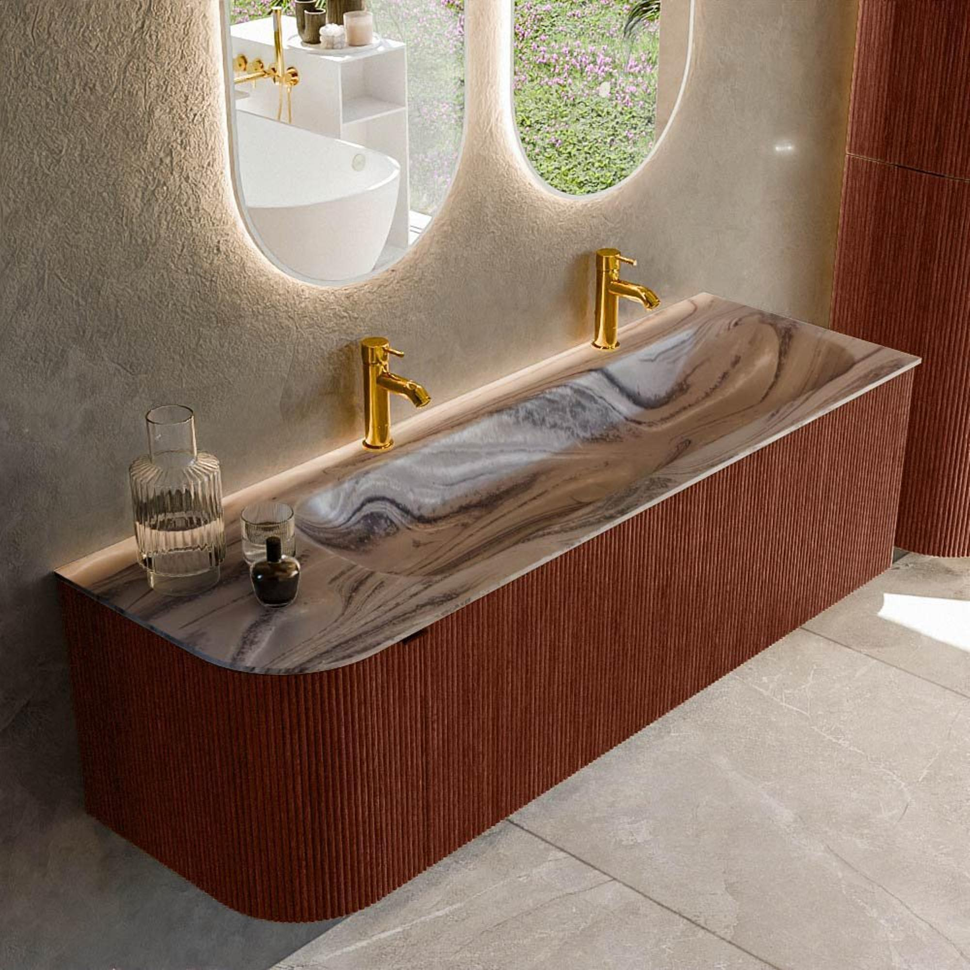 Le côté gauche arrondi donne au meuble une forme douce et organique qui attire immédiatement le regard et est en outre agréable au quotidien. Pas d'angle vif le long duquel vous passez, mais une ligne fluide qui rend le passage dans votre salle de bains plus agréable. La couleur Ruby apporte un accent chaleureux et luxueux qui se marie à merveille avec des carreaux neutres, des détails noirs ou au contraire des tons bois chauds. Comme la vasque est positionnée à droite, le côté arrondi reste visuellement léger et aéré, idéal lorsque le meuble est par exemple placé près de la porte ou le long d'un passage. Vous apportez ainsi un véritable point de mire dans votre intérieur, non seulement beau, mais aussi conçu avec soin pour le confort et la perception de l'espace.
