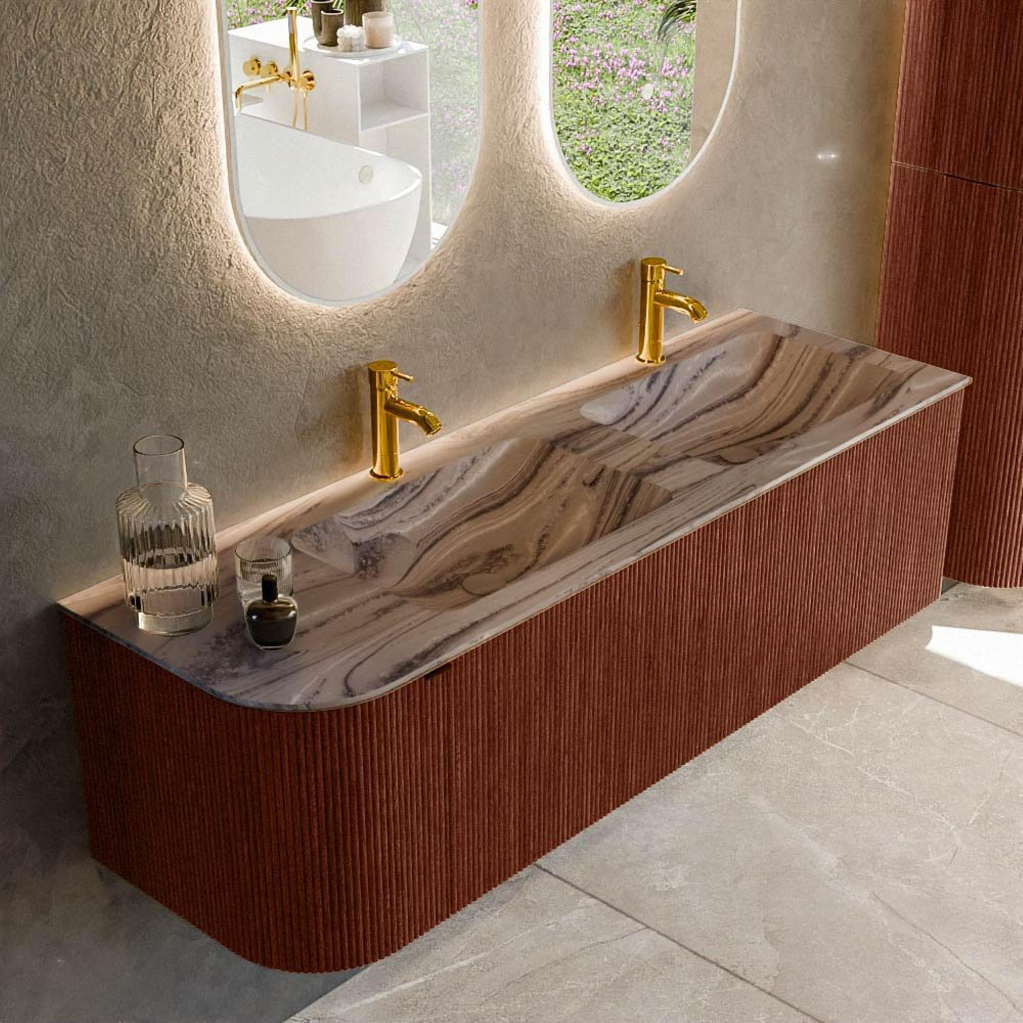 La combinaison de la teinte Ruby profonde avec la façade à nervures verticales fait de ce meuble un véritable accroche-regard dans votre salle de bains. La façade est réalisée en bois véritable, ce qui permet au veinage et à la texture de rester subtilement visibles et donne immédiatement une impression haut de gamme à l’ensemble. L’angle arrondi sur le côté gauche crée un langage de formes plus doux qu’un meuble standard rectangulaire et rend le passage le long du meuble plus agréable et plus sûr, par exemple près d’un couloir ou à côté d’une douche. Grâce à la finition épurée, sans poignées, avec système push-to-open, la façade reste sobre et moderne, sans poignées saillantes. Ce meuble s’intègre ainsi parfaitement dans une salle de bains contemporaine et design, mais aussi dans des intérieurs chaleureux de style hôtel chic où la couleur et la perception des matériaux sont importantes.