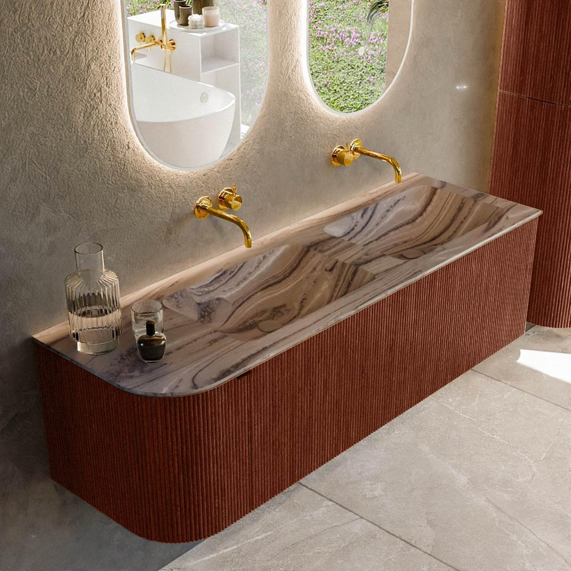 La forme rectangulaire avec angles arrondis confère à ce meuble un caractère moderne, presque digne d’un hôtel, tandis que l’arrondi à gauche donne à l’ensemble une apparence douce et fluide. La couleur Ruby crée un accent fort dans votre salle de bains et est idéale si vous souhaitez faire une déclaration sans renoncer au raffinement. En combinaison avec la couleur Sombra du plan vasque, il en résulte un contraste élégant qui s’accorde parfaitement avec des robinets et accessoires noirs, chromés ou colorés. La façade nervurée avec lignes verticales apporte en plus davantage de profondeur et de luxe, surtout en combinaison avec un bon éclairage. Ainsi, votre zone de lavabo devient véritablement le point central de la pièce et chaque début et fin de journée prend une dimension un peu plus spéciale.