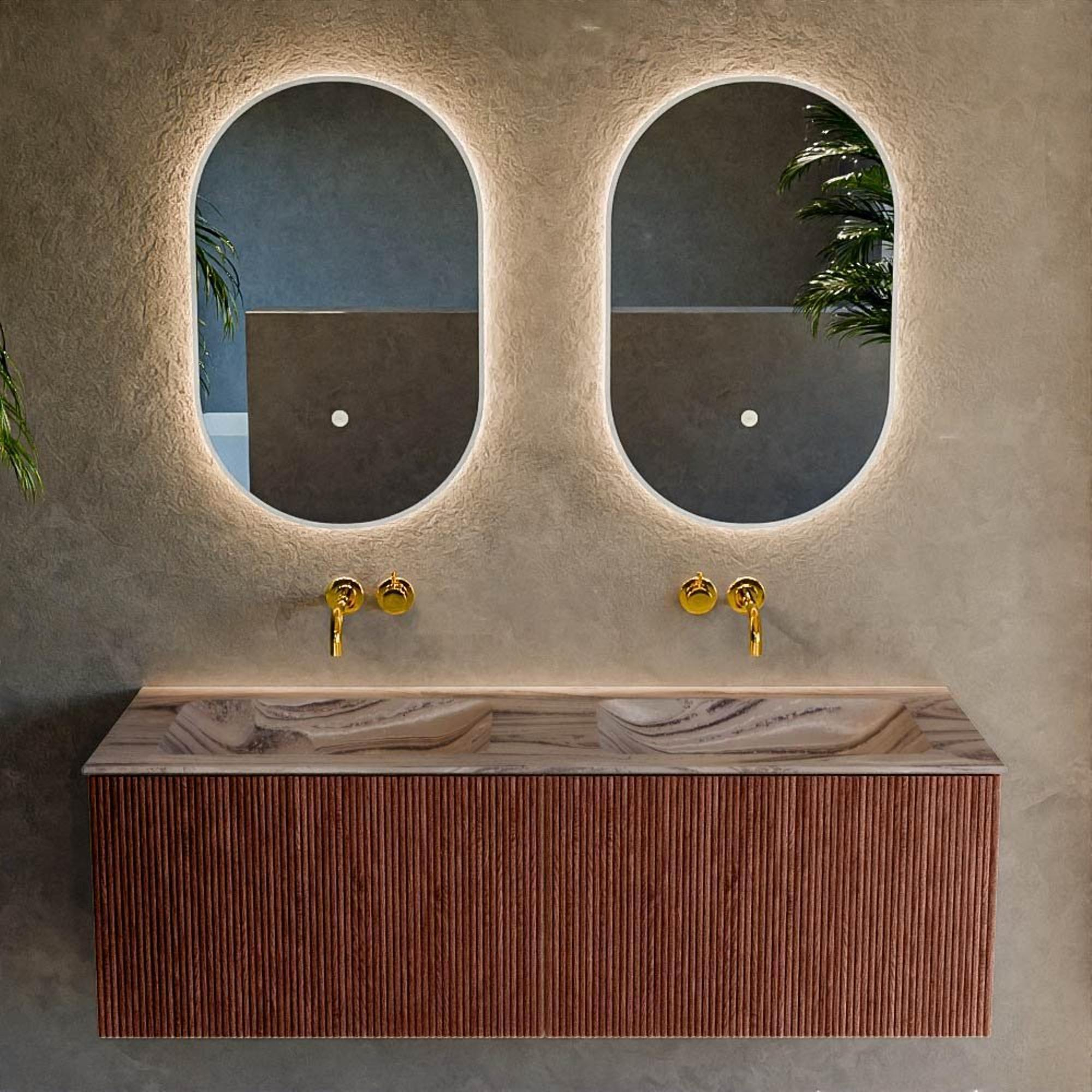 Si vous recherchez un meuble de salle de bains remarquable qui combine design, praticité et matériaux de haute qualité, cette version est alors un candidat très solide. La largeur généreuse de 130 cm et le double lavabo rendent ce meuble idéal pour une famille occupée, un couple qui aime utiliser la salle de bains en même temps ou une salle de bains spacieuse et luxueuse de type hôtel. La couleur chaleureuse Ruby avec façade nervurée crée une apparence luxueuse et moderne qui s’accorde parfaitement aussi bien avec des carreaux épurés qu’avec des matériaux naturels. Grâce au montage mural, le meuble semble flotter, ce qui donne non seulement une impression d’espace, mais rend également le nettoyage du sol beaucoup plus simple. Le double lavabo sans trou de robinet de couleur Sombra s’intègre parfaitement dans un look minimaliste avec des robinetteries sur gorge et offre amplement d’espace pour un usage quotidien. Ce meuble trouve parfaitement sa place dans les salles de bains de taille moyenne à grande, où vous optez consciemment pour la qualité, le confort et une déclaration de design affirmée.