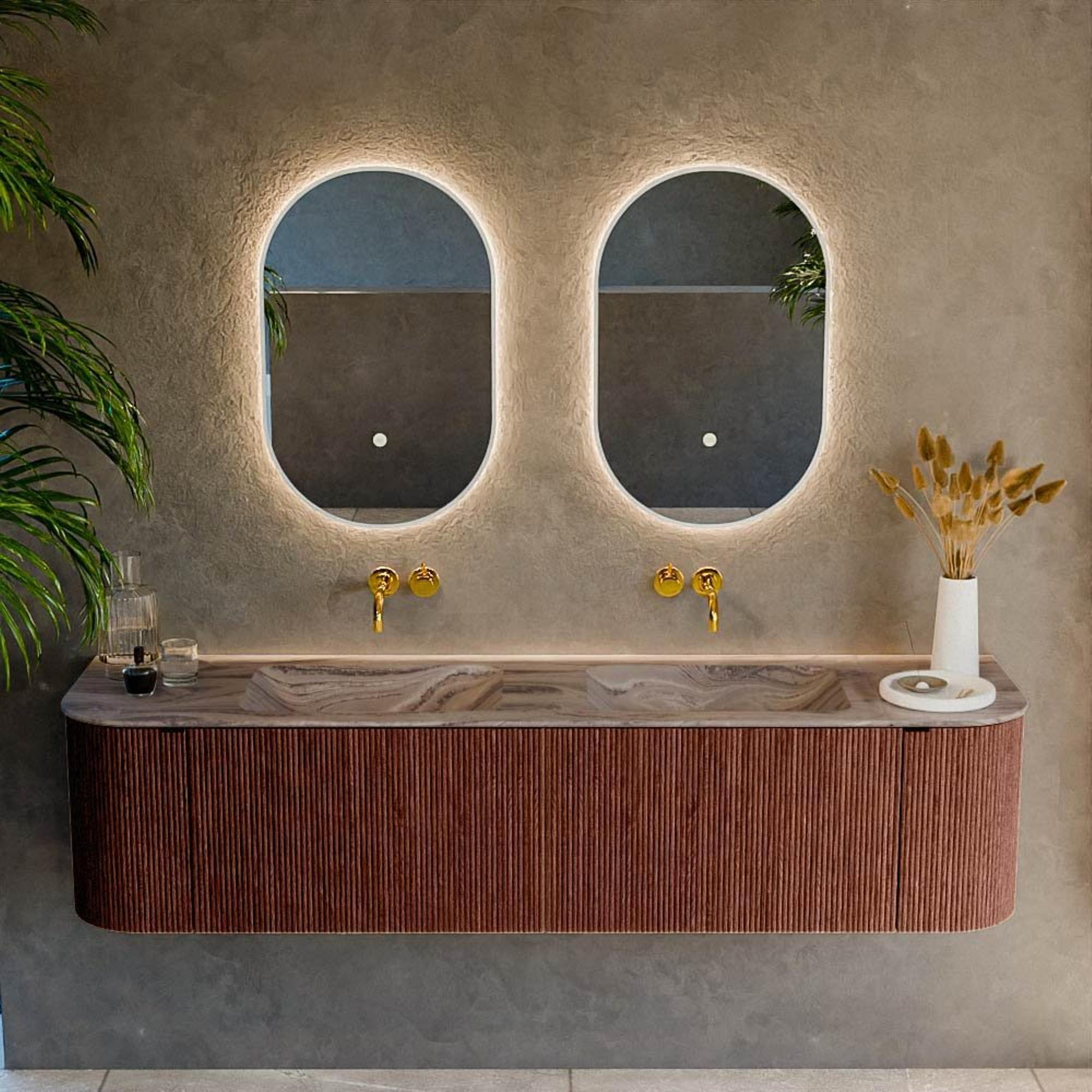La teinte Ruby chaleureuse confère au meuble une allure luxueuse et distinctive qui apporte immédiatement de l’ambiance à la pièce. En combinaison avec la façade rainurée verticale, un jeu de lumière ludique et une grande profondeur dans l’effet bois se créent, de sorte que le meuble ne paraît jamais plat ou ennuyeux. Les angles arrondis des deux côtés adoucissent l’apparence et permettent à l’ensemble de s’accorder parfaitement avec les formes organiques des salles de bains modernes. Cela en fait un choix parfait si vous souhaitez faire une déclaration sans sacrifier le côté intemporel : suffisamment audacieux pour se faire remarquer, mais assez sobre pour s’accorder pendant des années avec des styles et des choix de carrelage changeants.