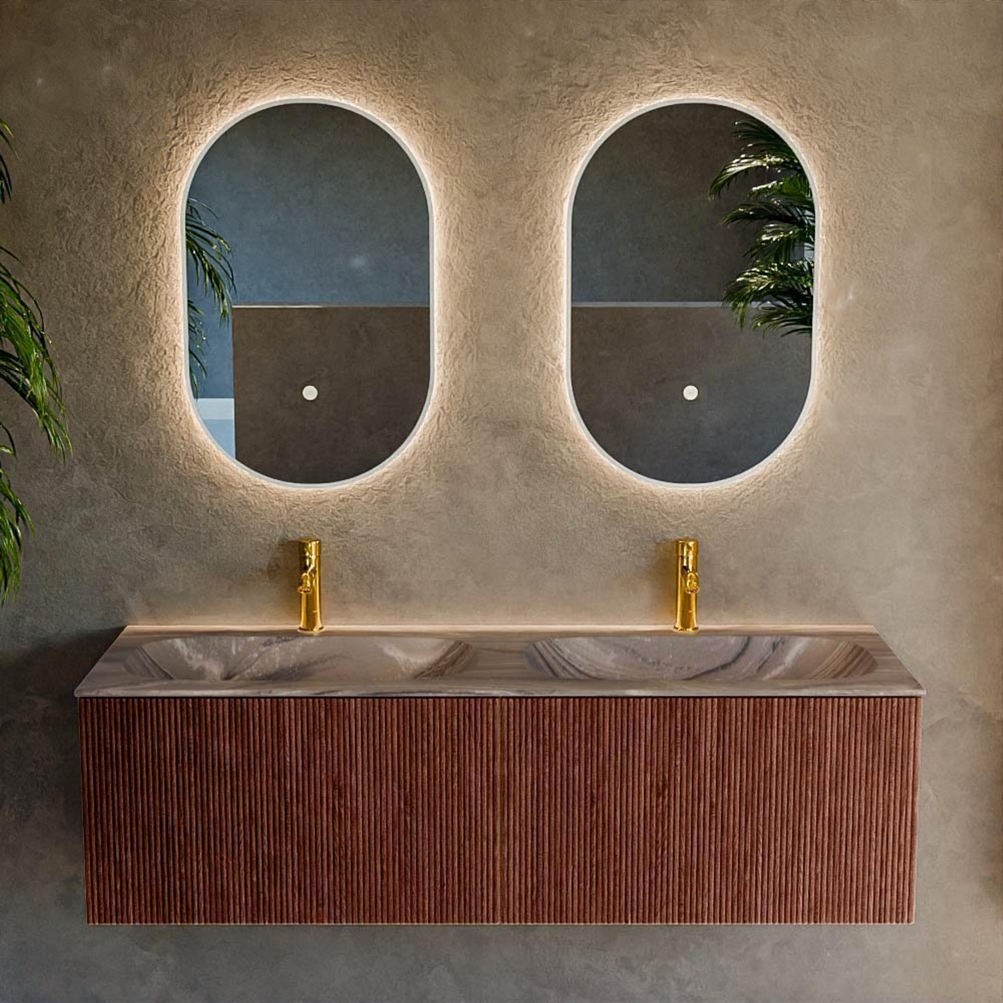 La couleur Ruby profonde combinée à la façade à rainures verticales fait de ce meuble un véritable accroche-regard dans votre salle de bains. La structure subtile en 3D capte la lumière de manière ludique, ce qui donne à la façade une apparence différente au fil de la journée. Votre salle de bains obtient ainsi immédiatement un aspect luxueux digne d’un intérieur, comparable à celui des salles de bains d’hôtels haut de gamme ou des appartements design. Le système push-to-open sans poignées renforce le caractère minimaliste : aucune poignée gênante, seulement une façade continue et élégante. Vous combinez ainsi chaleur et caractère avec une base moderne et apaisante sur laquelle vous pouvez facilement harmoniser d’autres éléments, comme les robinets, les carreaux et les accessoires.