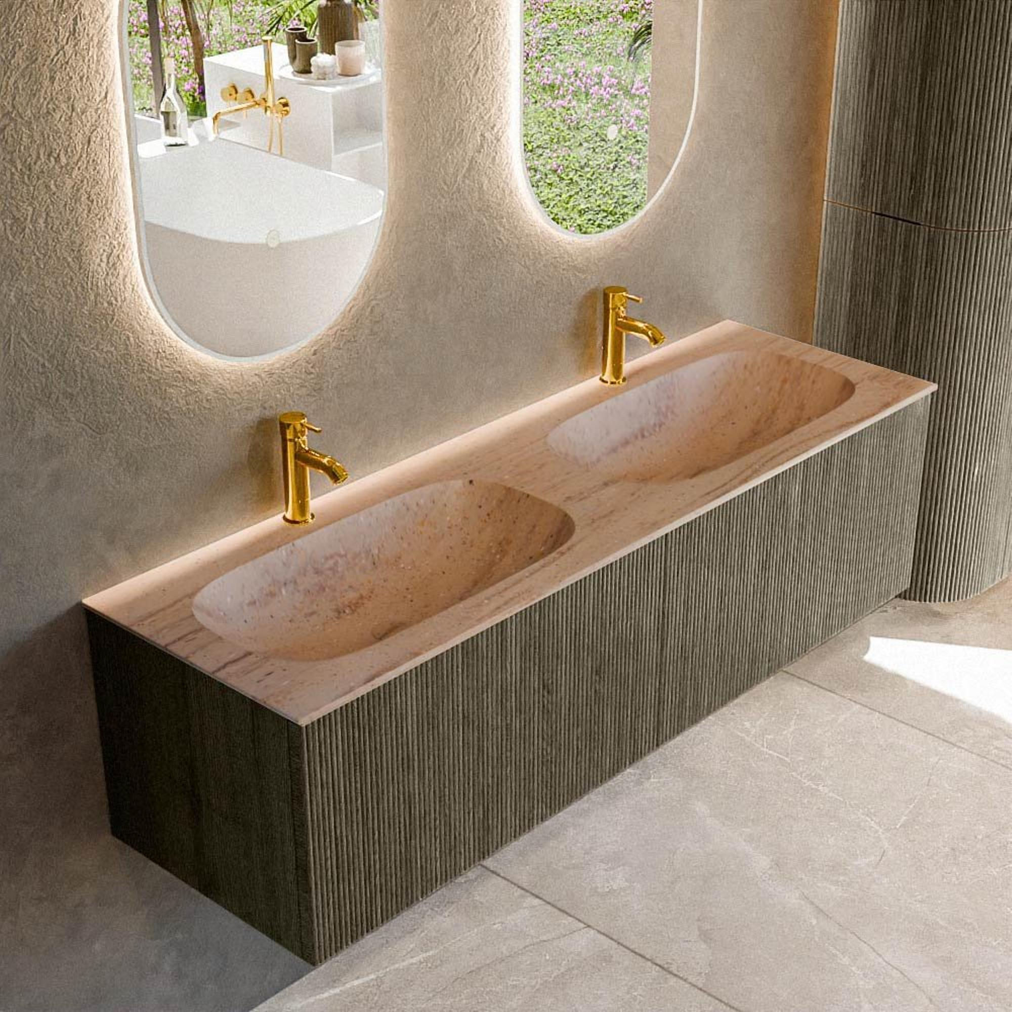 La combinaison de la couleur Shadow pour le meuble et du plan-vasque Saba en beige confère un caractère moderne et luxueux avec une touche chaleureuse. La façade rainurée verticale crée un jeu de lignes dynamique et ajoute de la profondeur au design, ce qui ressort particulièrement bien à la lumière artificielle ou naturelle. Le meuble devient ainsi un véritable point de mire, sans être criard. La couleur de base grise est intemporelle et se marie facilement avec des robinets et accessoires noirs, chromés ou en métal brossé, mais aussi avec des matériaux naturels comme le bois et la pierre. Vous avez ainsi toute liberté pour développer davantage le style de votre salle de bains, que vous optiez pour un look hôtel chic, minimaliste ou une ambiance spa apaisante.