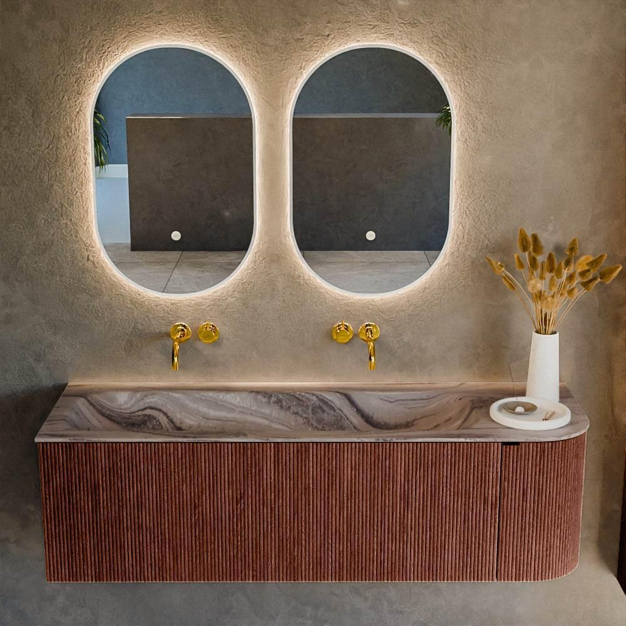 La forme arrondie sur le côté droit donne à ce meuble une apparence douce et organique qui fait la différence dans les salles de bains modernes. Pas d'angles vifs dans la ligne de circulation, mais un arrondi fluide qui suggère un espace supplémentaire et est agréable à contourner. La couleur Ruby profonde crée un contraste élégant avec les carreaux et le sanitaire clairs et donne immédiatement à votre salle de bains une apparence haut de gamme et design. La façade à rainures verticales renforce cette sensation de luxe et crée un beau jeu de lumière et d'ombre. Vous faites ainsi entrer un meuble dans votre maison qui n'est pas seulement pratique, mais qui constitue également un véritable point de mire dont vous profiterez pendant de nombreuses années.
