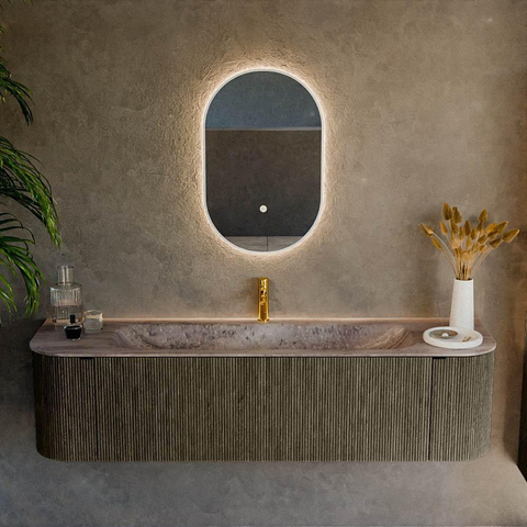 La combinaison de la largeur généreuse et des courbes subtiles des deux côtés donne à ce meuble une allure luxueuse, presque sur mesure. La couleur Shadow est une teinte de gris élégante qui apporte profondeur et chaleur à votre salle de bains, sans être dominante. Le meuble se combine ainsi parfaitement avec des carreaux blancs, couleur sable ou au contraire foncés, ainsi qu’avec des robinets noirs mats ou en inox. Les façades rainurées avec profil 3D vertical créent un jeu de lumière et d’ombre ludique, faisant de ce meuble une pièce forte de design même sans armoire de toilette au-dessus. Grâce à la pose murale suspendue, le sol reste dégagé, ce qui donne à votre salle de bains une impression d’espace et de légèreté et facilite en plus le nettoyage.