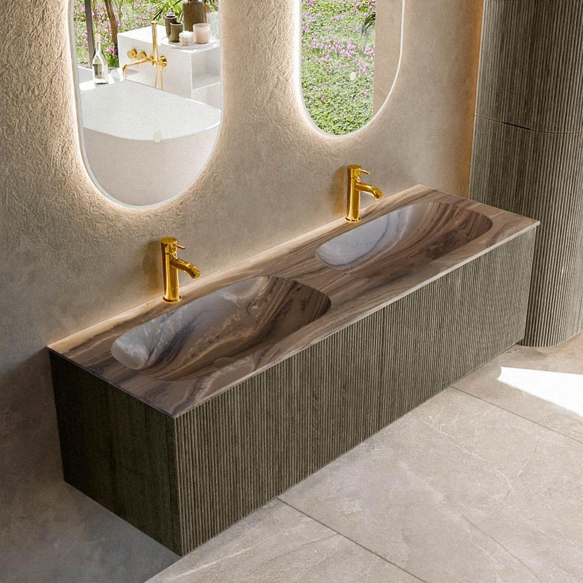 Avec ce meuble de salle de bains généreux, vous apportez un véritable accroche-regard dans votre maison qui n’est pas seulement beau, mais qui rend aussi votre routine quotidienne dans la salle de bains sensiblement plus confortable. Grâce à la double vasque et à la largeur de 150 cm, c’est une solution idéale pour les matinées chargées : deux personnes peuvent utiliser la vasque en même temps, sans sacrifier l’espace ni la liberté de mouvement. La structure nervurée raffinée des façades, la teinte gris profond et la vasque assortie couleur anthracite créent ensemble une ambiance d’hôtel de luxe qui s’intègre parfaitement dans les salles de bains modernes, design et minimalistes. Grâce à la fixation murale, le sol reste dégagé, ce qui donne à la pièce un aspect visuellement plus grand et plus calme. Ce meuble est particulièrement adapté si vous souhaitez une salle de bains épurée, ordonnée et haut de gamme, avec beaucoup d’espace de rangement et un beau contraste entre le meuble et le carrelage. Si vous recherchez un meuble intemporel qui combine un design élégant avec une utilisation pratique pour toute la famille ou une suite parentale luxueuse, alors c’est un choix très bien pensé.