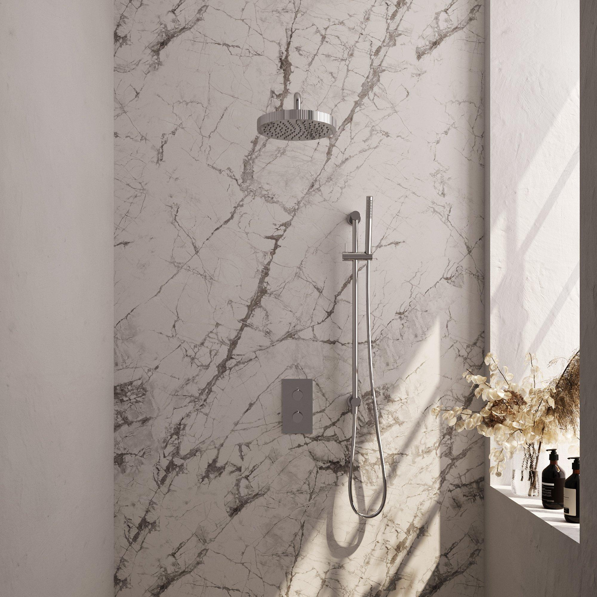 Avec le système 3 voies, vous passez aisément de la grande pomme de douche, à la douchette à main et au bras mural courbé. La barre coulissante intégrée permet de régler facilement la douchette à main, idéal pour toute la famille. La commande thermostatique assure une température sûre et constante, vous évitant les surprises d'eau froide ou chaude. Cette facilité d'utilisation combinée à la polyvalence fait de cette douche de tête un choix intelligent pour toute salle de bains.