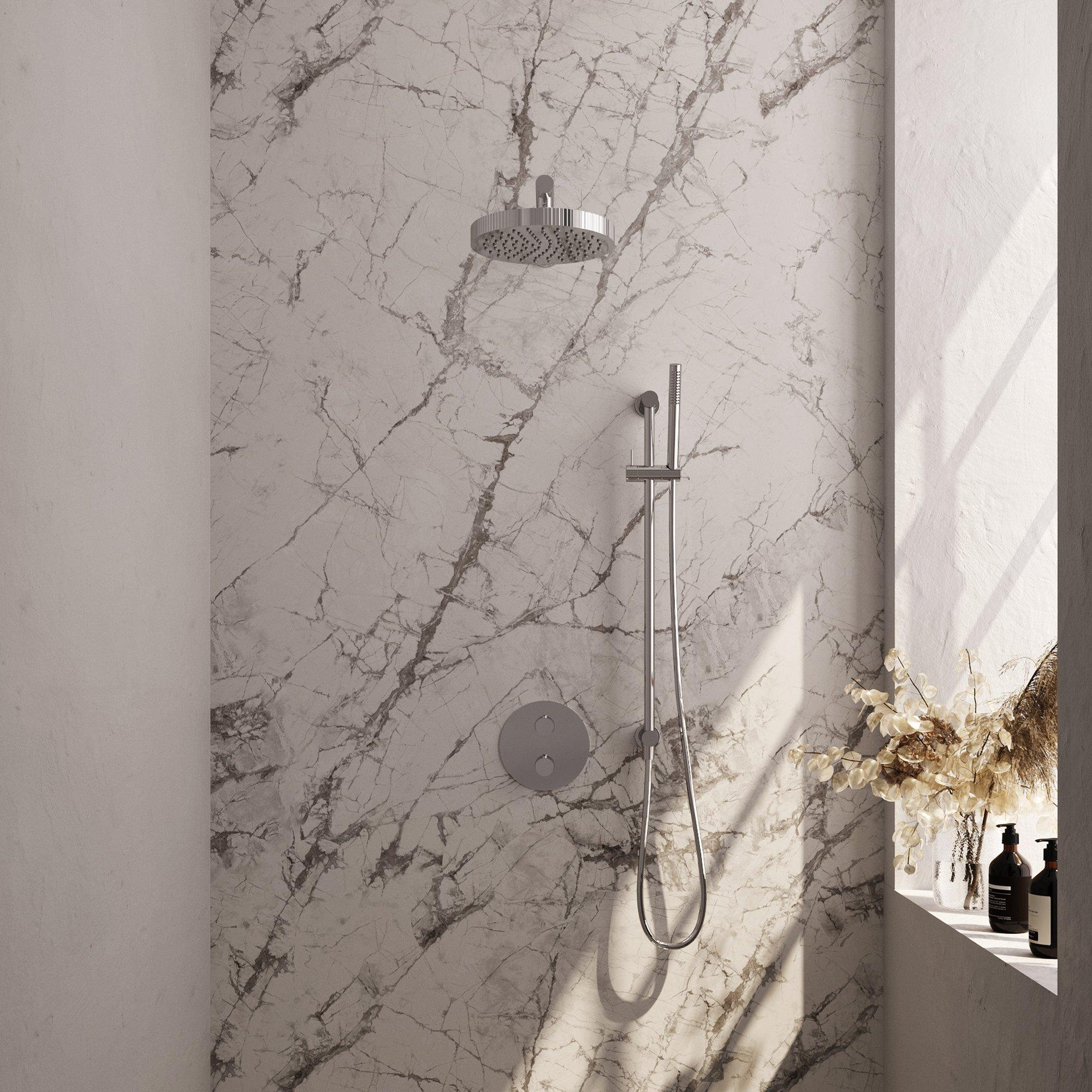 Avec la barre coulissante intégrée, la douchette à main et le robinet trois voies, vous avez un contrôle total sur votre expérience de douche. Passez facilement de la douche de pluie à la douchette à main, ou utilisez-les simultanément pour un moment de détente supplémentaire. La commande thermostatique garantit une température sûre et stable, pour ne plus jamais être surpris par de l'eau soudainement froide ou chaude. Grâce à la pose encastrée, votre salle de bains reste épurée et ordonnée, sans tuyauterie visible.