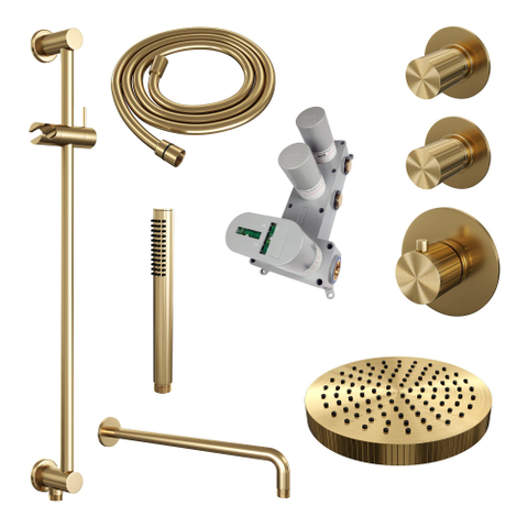 BRAUER Stripe Douche de pluie thermostatique encastrée - SET 08 - pomme de douche 25cm - bras mural courbé - douchette à main sur barre - flexible de douche - barre coulissante intégrée - PVD brossé or