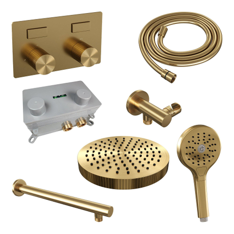 BRAUER Stripe Douche de tête thermostatique encastrée - boutons-poussoirs - SET 28 - pomme de douche 25cm - bras mural droit - douchette 3 positions - flexible de douche - coude mural - PVD doré brossé