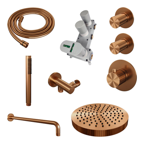 BRAUER Stripe Douche de tête thermostatique encastrable - SET 02 - pomme de douche 25cm - bras mural courbé - douchette sur barre - flexible de douche - coude mural - cuivre brossé PVD