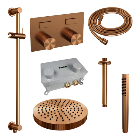 BRAUER Stripe Douche de tête thermostatique encastrée - boutons-poussoirs - SET 33 - pomme de douche 25cm - bras de plafond - douchette à main avec barre coulissante intégrée - flexible de douche - cuivre brossé PVD