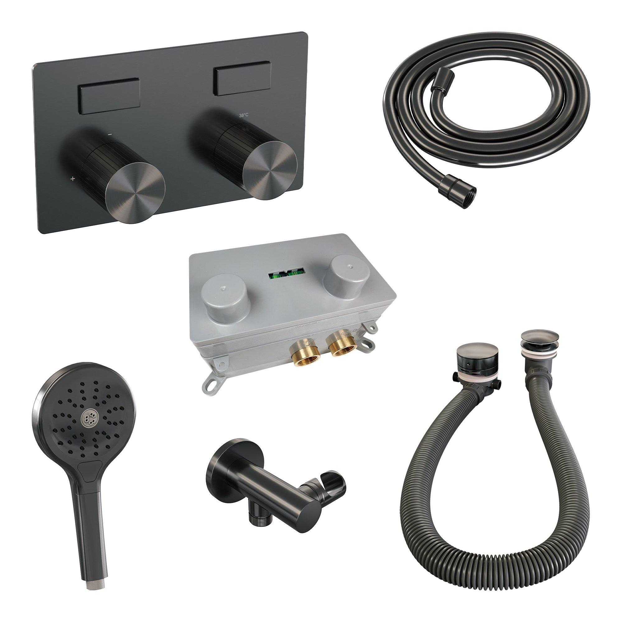 BRAUER Stripe Mitigeur thermostatique baignoire - boutons-poussoirs - SET 04 - encastré - combinaison remplissage baignoire - douchette 3 positions - flexible de douche - coude mural - gunmetal brossé PVD