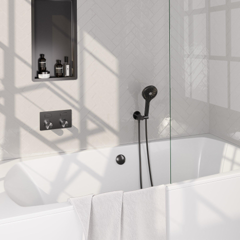 Imaginez comment votre salle de bains se transforme avec un robinet qui n'est pas seulement fonctionnel, mais qui fait aussi une déclaration. Ce mitigeur de baignoire encastré élève votre expérience de bain grâce à son régulateur thermostatique intelligent et son design épuré. Grâce à la couleur subtile gunmetal avec une finition brossée PVD, votre salle de bains acquiert une apparence moderne et luxueuse qui est intemporelle. Avec les boutons-poussoirs pratiques, vous contrôlez facilement les différentes fonctions, tandis que la douchette incluse avec trois positions offre un confort et une flexibilité supplémentaires. Cet ensemble est conçu pour rendre votre routine quotidienne plus agréable et plus simple, en accordant de l'attention à la fois au style et à la facilité d'utilisation. Ainsi, vous profitez chaque jour d'une température d'eau parfaitement réglée et d'une apparence élégante qui complète votre salle de bains.