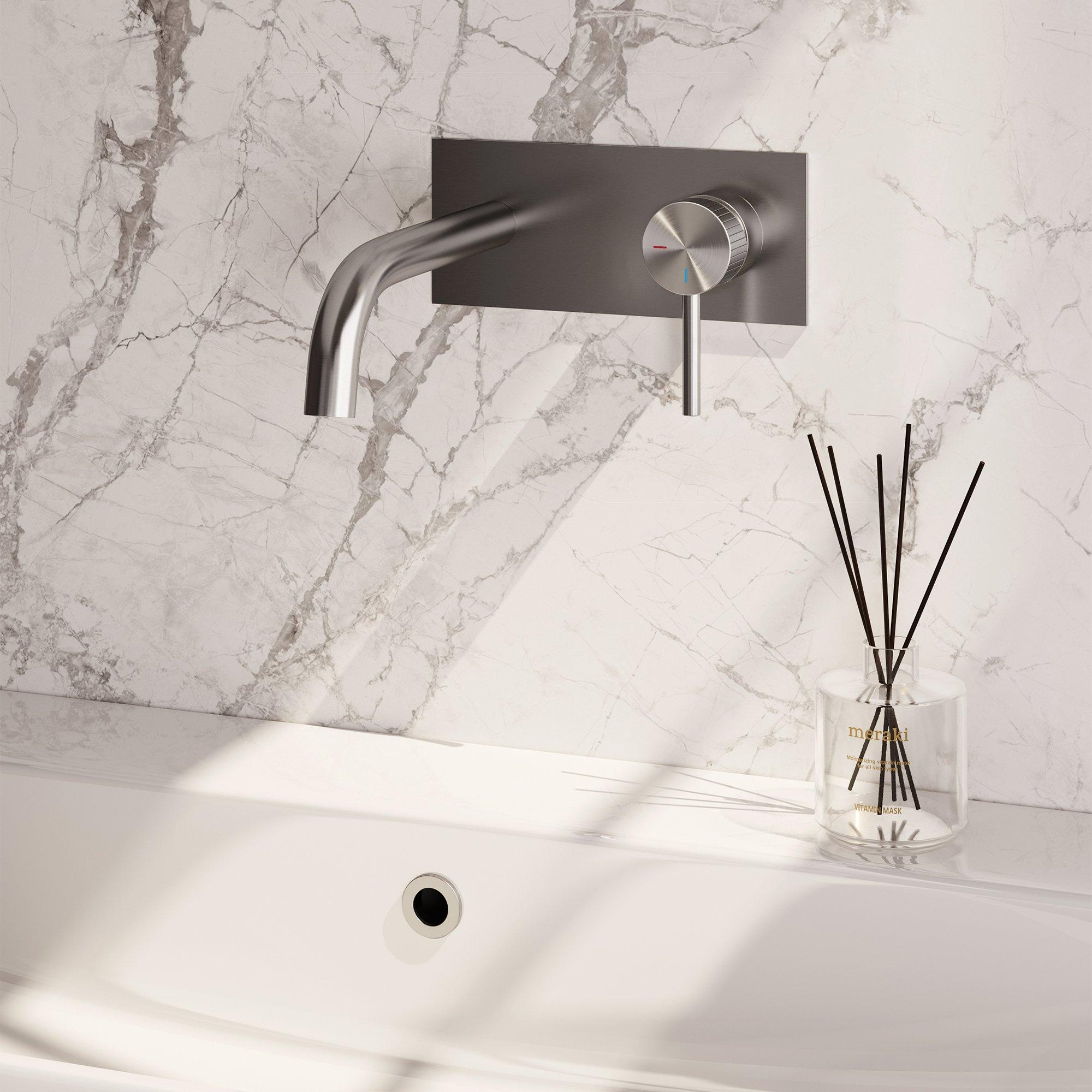 Ce robinet est un exemple de design intemporel. Le bec courbé offre une forme douce et fluide qui s'adapte parfaitement aux salles de bains modernes. La finition inox brossé couleur PVD procure un aspect mat et luxueux qui ne s'estompera ni ne décolorera rapidement. Cela fait du robinet non seulement un élément accrocheur, mais aussi un investissement durable dans l'esthétique de votre salle de bains. Grâce au design minimaliste encastré, l'accent reste sur des lignes épurées et la simplicité, ce qui ajoute calme et élégance à votre intérieur.