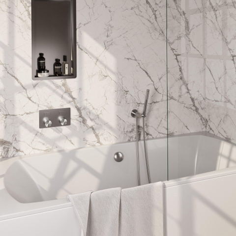 La surface couleur inox brossé donne à ce mitigeur de baignoire une apparence moderne et raffinée qui attire immédiatement l’attention. La finition subtile fait du mitigeur un ajout élégant à toute salle de bains, sans dominer. Ce design intemporel s’adapte parfaitement aux salles de bains épurées et minimalistes ainsi qu’aux intérieurs plus chaleureux et naturels. De plus, la surface reste belle plus longtemps grâce au revêtement PVD de haute qualité, résistant aux rayures et facile d’entretien. Ainsi, vous profitez non seulement d’un produit magnifique, mais aussi d’une apparence durable qui élève votre salle de bains à un niveau supérieur.