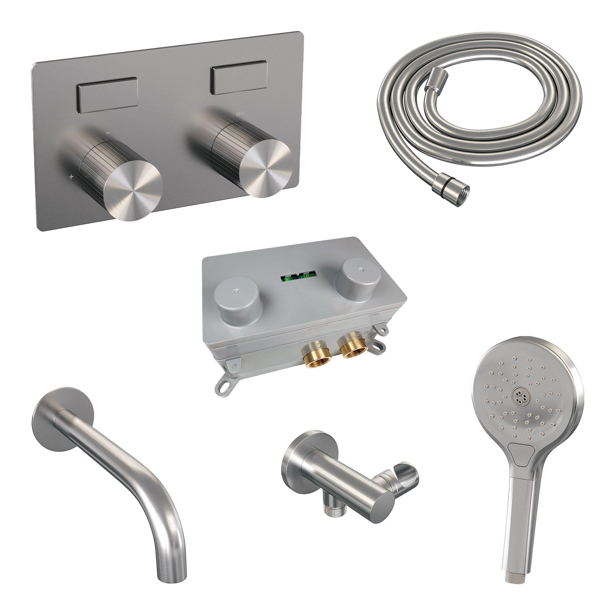 BRAUER Stripe Mitigeur thermostatique bain - boutons-poussoirs - SET 04 - encastré - bec - douchette 3 positions - flexible de douche - coude mural - couleur inox brossé PVD