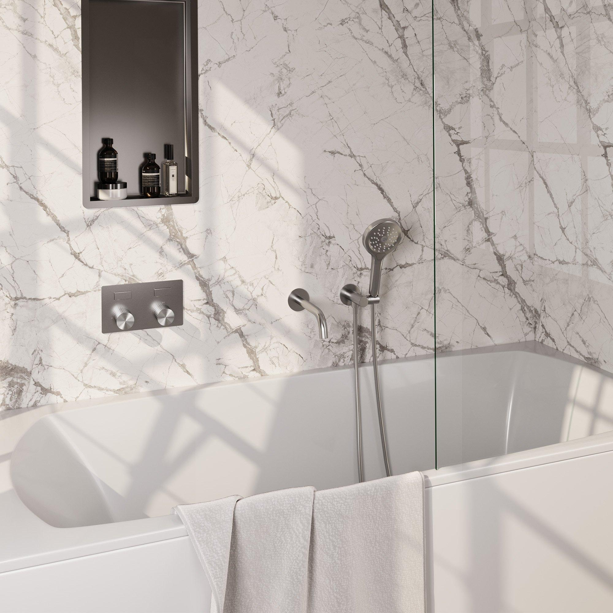 Ce mitigeur de bain est un véritable point fort grâce à son design épuré et minimaliste et à sa finition couleur inox brossé. La brillance subtile du laiton revêtu PVD confère un aspect luxueux qui ne se démodera pas rapidement. Grâce au design encastré, le mitigeur reste bien intégré dans le mur, ce qui crée une salle de bains calme et ordonnée. Cela en fait non seulement un choix esthétique, mais aussi intelligent, car l’entretien est plus facile sans parties saillantes. Vous profitez ainsi d’une salle de bains qui a toujours l’air soignée et moderne.