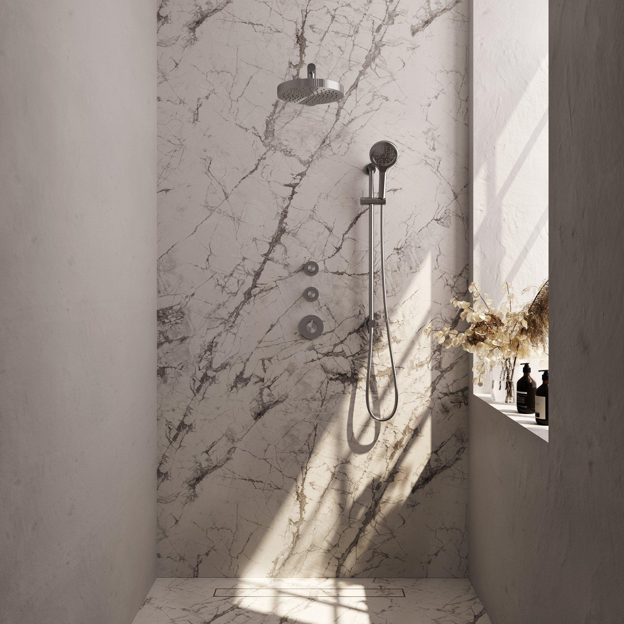 Ce set de douche de tête est conçu avec un souci du détail et une apparence moderne. La surface couleur inox brossé offre un éclat subtil qui paraît non seulement élégant, mais résiste aussi aux traces de doigts et aux taches d’eau. Le bras mural droit et la barre coulissante intégrée assurent un look épuré et minimaliste, apportant une ambiance calme et luxueuse à votre salle de bains. Grâce à sa couleur et sa finition intemporelles, ce set s’adapte parfaitement à divers styles d’intérieur, du moderne à l’industriel. Vous ajoutez ainsi non seulement de la fonctionnalité, mais aussi une touche stylée à votre salle de bains.