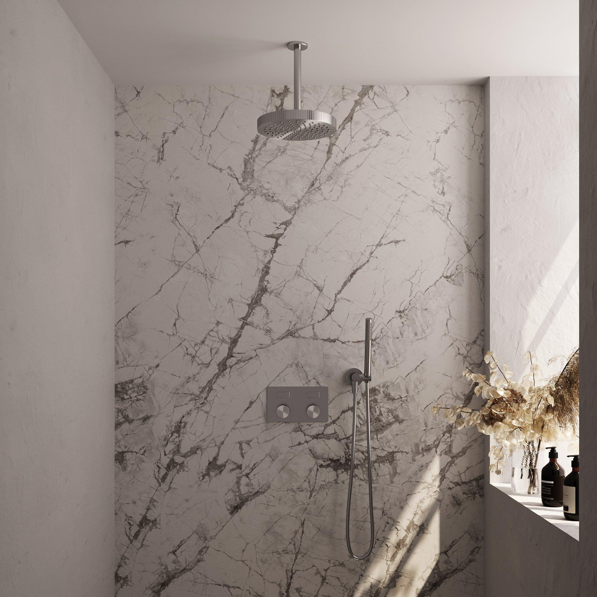Le design de cette douche de tête dégage une pure élégance. La finition couleur inox brossé avec PVD offre un éclat subtil qui ne s'estompera pas rapidement. Cela en fait un choix durable qui conserve son aspect moderne pendant des années. Grâce au design minimaliste, ce set s'intègre parfaitement aussi bien dans des salles de bains modernes et épurées que dans des intérieurs plus classiques. Le bras de plafond et la pomme de douche ronde de 25 cm offrent un look impressionnant mais discret. Ainsi, vous ajoutez une touche élégante à votre salle de bains sans qu'elle domine. Avec cette douche de tête, vous offrez à votre salle de bains une mise à niveau qui convainc tant visuellement que fonctionnellement.