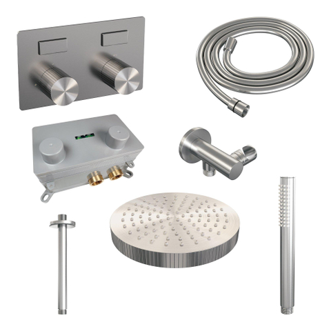 BRAUER Stripe Douche de tête thermostatique encastrée - boutons-poussoirs - SET 27 - pomme de douche 25cm - bras de plafond - douchette à main barre - flexible de douche - coude mural - couleur inox brossé PVD