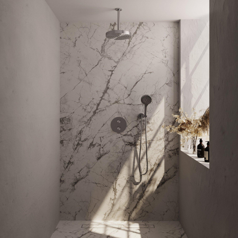 Cette douche de pluie se distingue immédiatement par son design élégant et intemporel. La pomme de douche ronde de 25 cm et le discret bras de plafond forment un ensemble harmonieux qui s'intègre sans effort dans toute salle de bains moderne. La finition inox brossé PVD confère à l'ensemble une apparence luxueuse qui ne se démodera pas rapidement. Grâce à la pose encastrée, votre mur reste épuré et minimaliste, assurant une apparence calme et stylée. Avec cette douche de pluie, vous ajoutez un véritable élément phare qui donne à votre salle de bains une apparence exclusive et soignée.