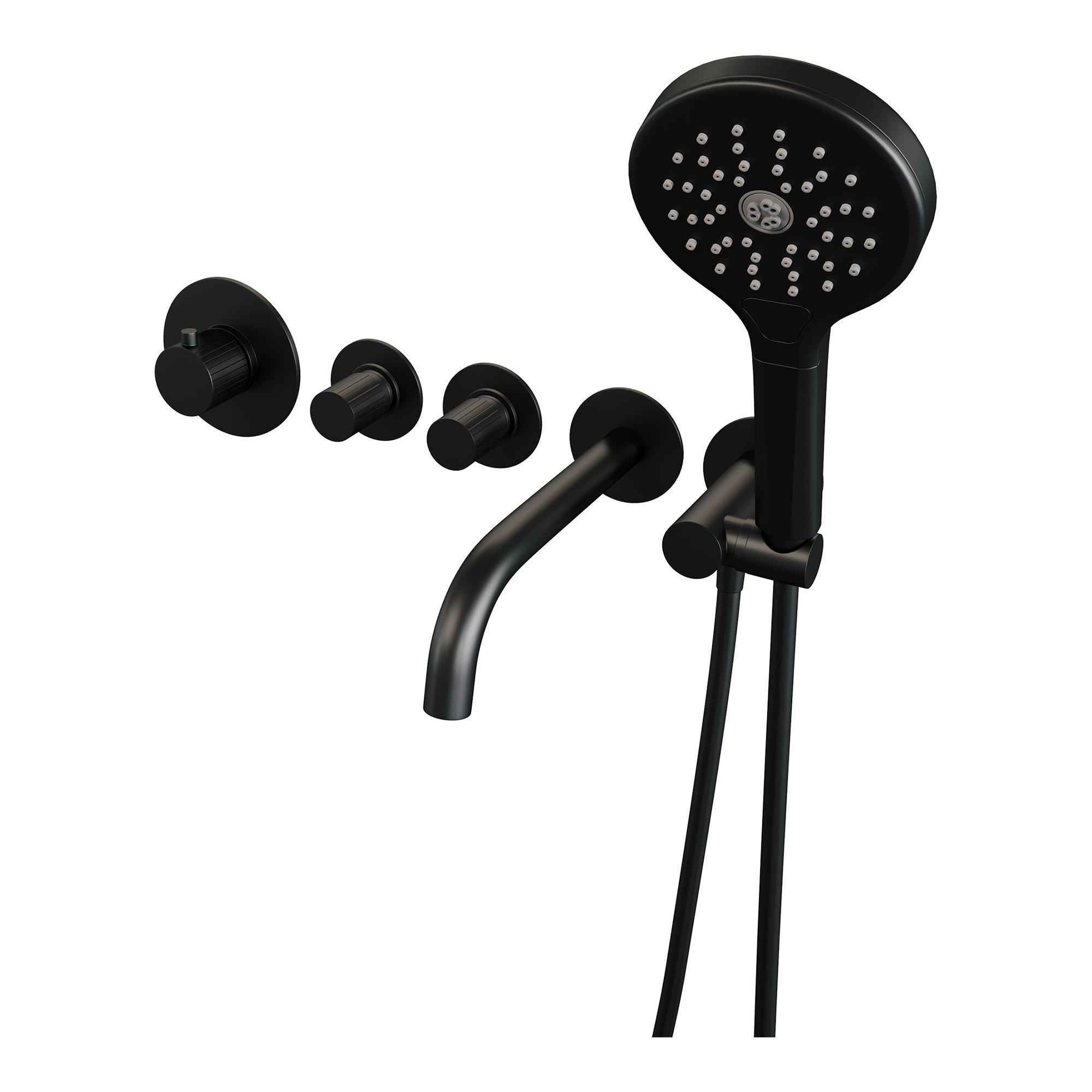 Transformez votre salle de bains avec ce mitigeur de baignoire encastré de haute qualité qui est non seulement fonctionnel mais aussi élégant. Grâce à son design noir mat épuré, votre salle de bains acquiert immédiatement une atmosphère moderne et luxueuse. Cet ensemble vous offre la combinaison parfaite de confort et de facilité d'utilisation, avec un thermostat intégré qui assure une température d'eau constante. Profitez ainsi d'un bain ou d'une douche relaxant sans variations soudaines de température. La douchette à main 3 positions vous donne en outre la liberté d'ajuster le jet d'eau selon vos souhaits. Avec cet ensemble complet, incluant flexible de douche et coude mural, vous rendez votre salle de bains non seulement plus belle, mais aussi plus pratique et confortable. Découvrez par vous-même comment ce mitigeur de baignoire enrichit votre routine quotidienne et transforme votre salle de bains en une oasis de calme et de style.