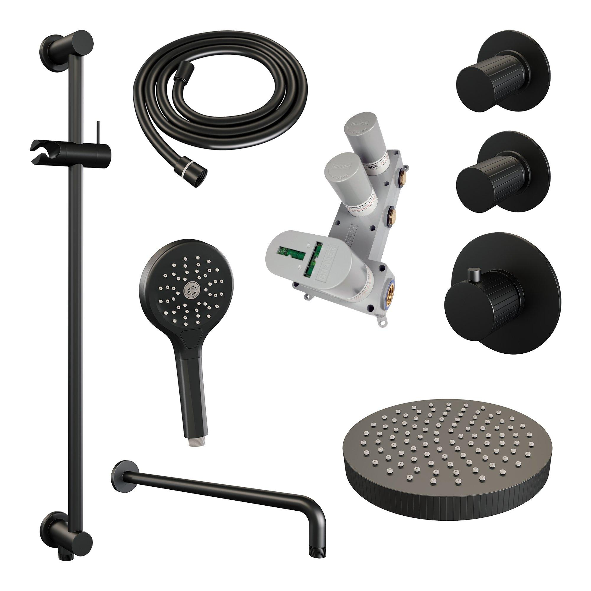 BRAUER Stripe Douche de tête thermostatique encastrable - SET 11 - pomme de douche 25cm - bras mural courbé - douchette 3 positions - flexible de douche - barre coulissante intégrée - noir mat