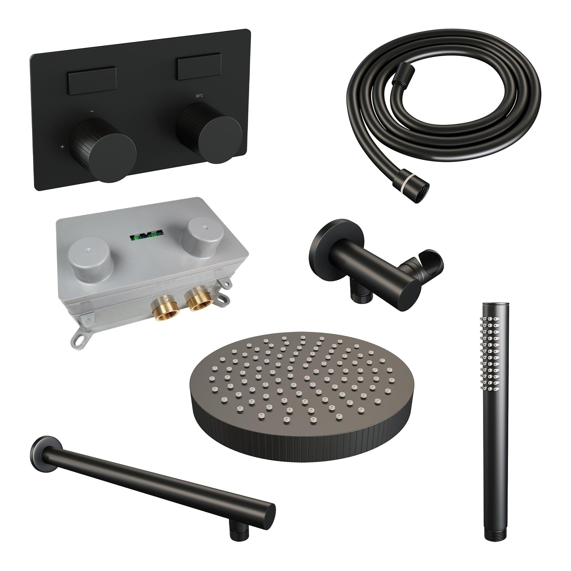BRAUER Stripe Douche de tête thermostatique encastrée - boutons-poussoirs - SET 25 - pomme de douche 25cm - bras mural droit - douchette à main barre - flexible de douche - coude de raccord mural - noir mat