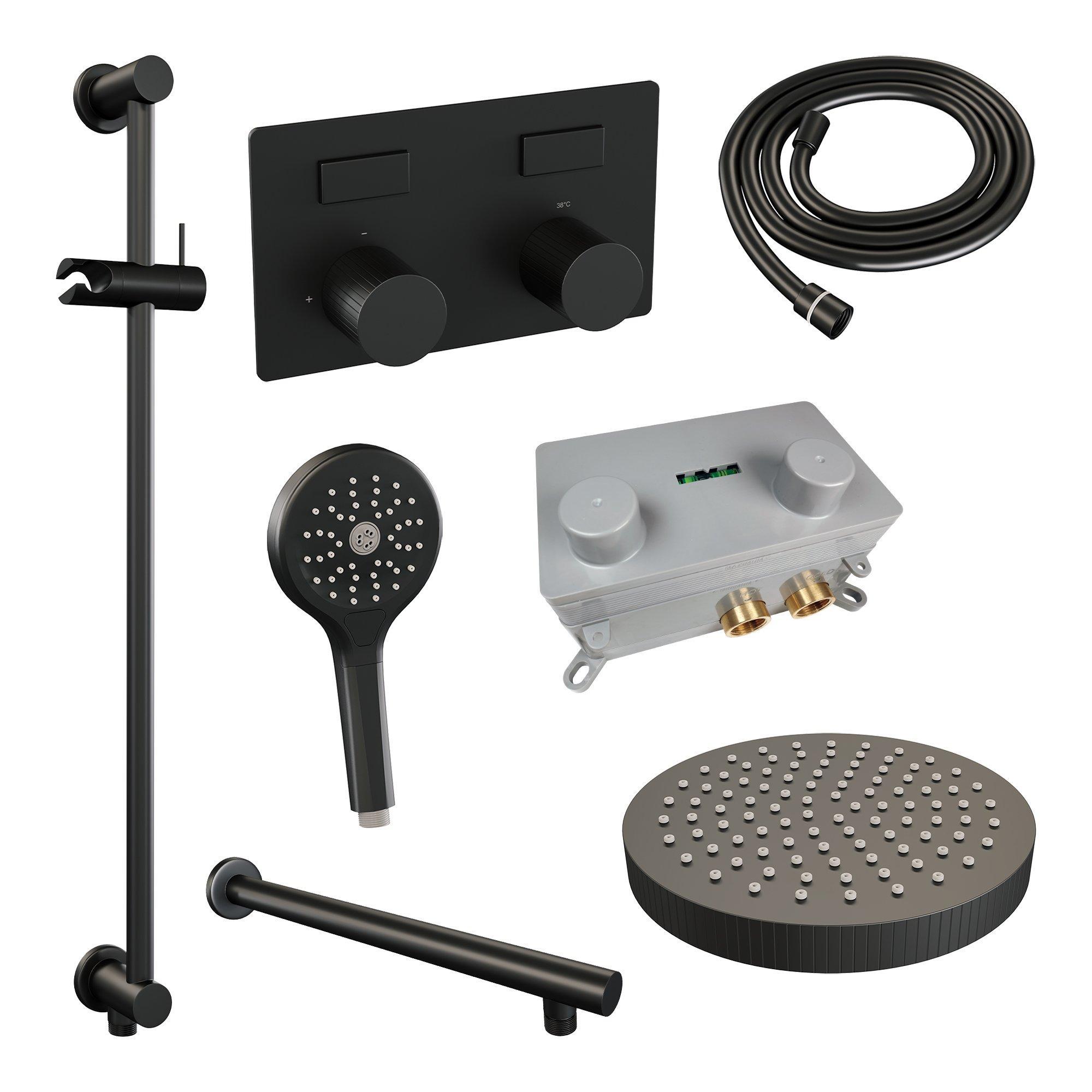 BRAUER Stripe Douche de pluie encastrée thermostatique - boutons-poussoirs - SET 34 - pomme de douche 25 cm - bras mural droit - douchette 3 jets - flexible de douche - barre de douche intégrée - noir mat
