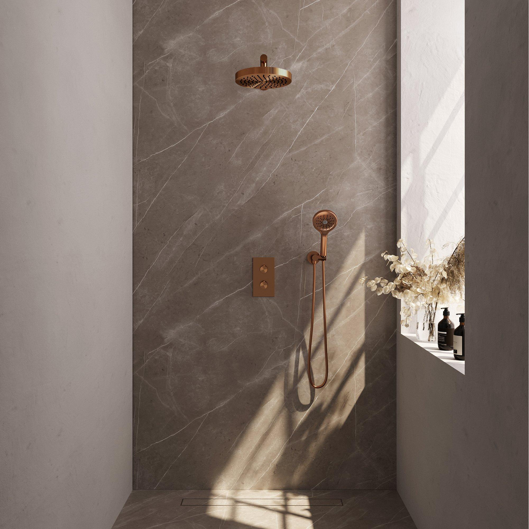 BRAUER Stripe Douche de pluie encastrée thermostatique - 3 voies - rectangulaire - pomme de douche 25 cm - bras mural droit - douchette 3 jets - flexible de douche - coude de sortie mural - cuivre brossé PVD