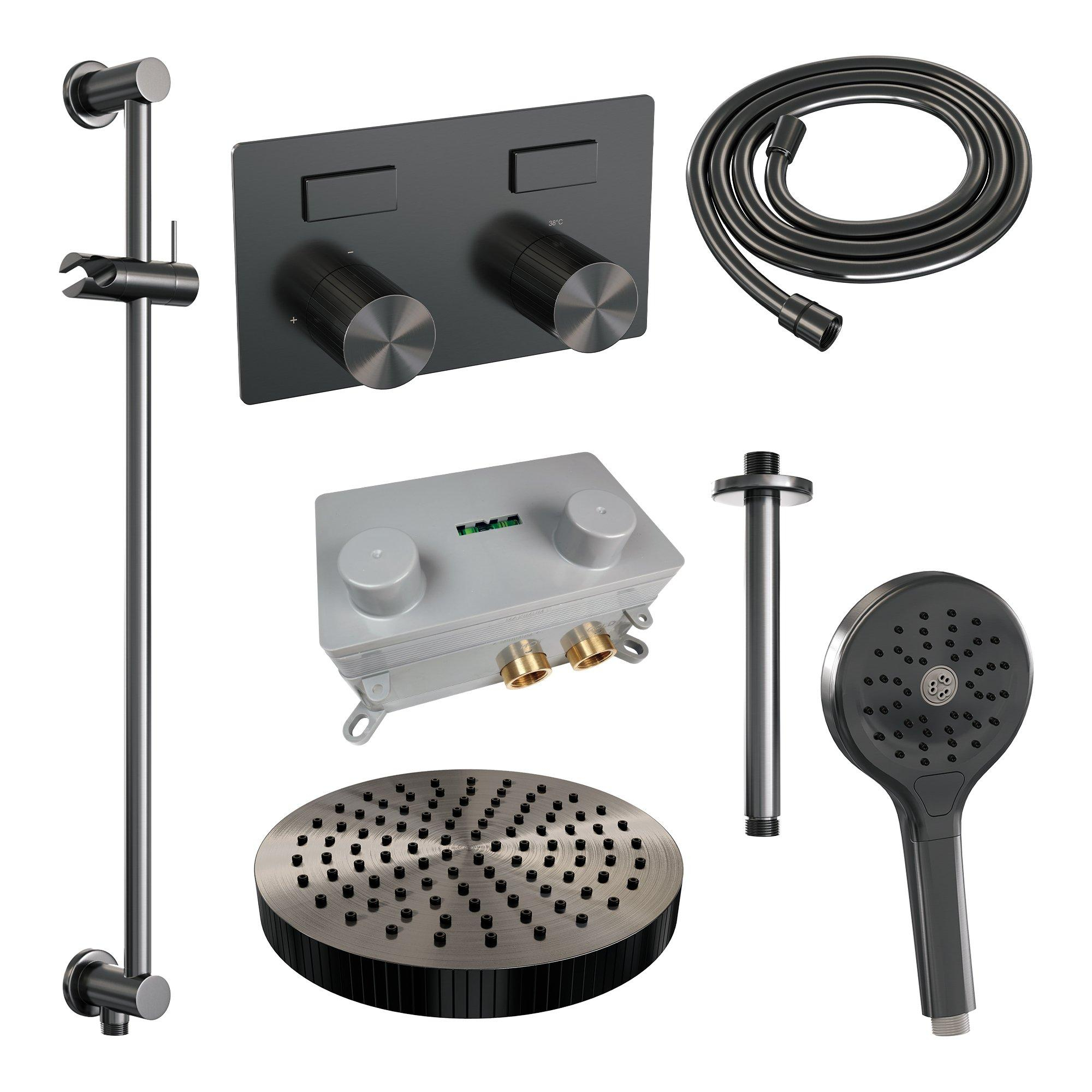 BRAUER Stripe Douche de pluie encastrée thermostatique - boutons-poussoirs - pomme de douche 25 cm - bras de plafond - douchette à main 3 jets - flexible de douche - barre de douche intégrée - gunmetal brossé PVD