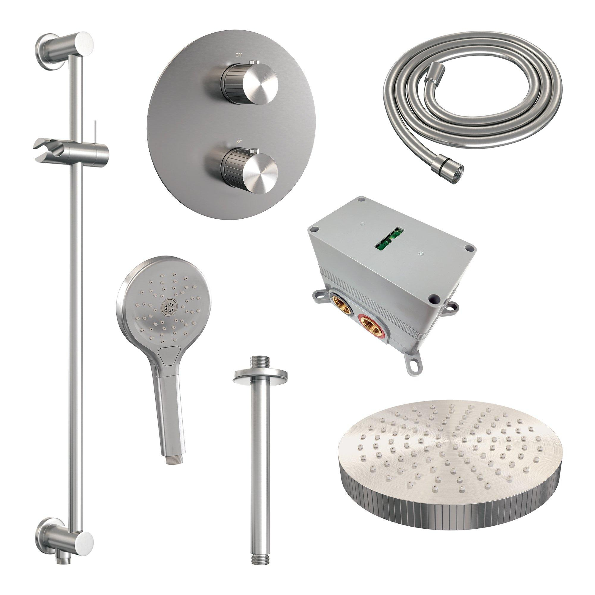 BRAUER Stripe Douche de tête thermostatique encastrée - 3 voies - ronde - pomme de douche 25 cm - bras plafond - douchette 3 positions - flexible de douche - barre coulissante intégrée - couleur inox brossé PVD