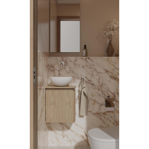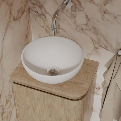 Avec ce meuble compact et élégant, vous donnez immédiatement à votre salle de bains un aspect frais et moderne. Le meuble est parfaitement conçu pour optimiser l'utilisation de l'espace, sans compromettre l'élégance ni la fonctionnalité. Grâce à l'arrondi subtil sur le côté gauche et à l'angle sur le côté droit, il s'intègre parfaitement dans les petites salles de bains ou toilettes où chaque centimètre compte. Le placage bois blanc épuré crée une atmosphère claire et aérée, tandis que le design sans poignée confère à l'ensemble une apparence calme et contemporaine. Ce meuble offre non seulement un espace de rangement pratique derrière la porte, mais aussi un plan de toilette solide sur lequel vous pouvez facilement poser vos accessoires de salle de bains. Comme le plan de toilette est sans trou de robinet, vous décidez vous-même où placer le robinet, ce qui offre une flexibilité supplémentaire lors de l'installation. Ainsi, vous créez une salle de bains qui non seulement est belle, mais correspond parfaitement à vos souhaits et à votre confort d'utilisation.