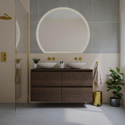 La combinaison de chêne massif avec une finition charcoal donne à ce meuble une apparence unique et élégante. Le panneau à rainures verticales apporte une texture subtile qui confère du caractère et de la profondeur au meuble. Grâce au design sans poignée, le meuble reste épuré et minimaliste, ce qui correspond parfaitement aux tendances modernes de la salle de bains. Vous ajoutez ainsi non seulement de la fonctionnalité, mais aussi un véritable élément accroche-regard qui donne à votre salle de bains une apparence exclusive.