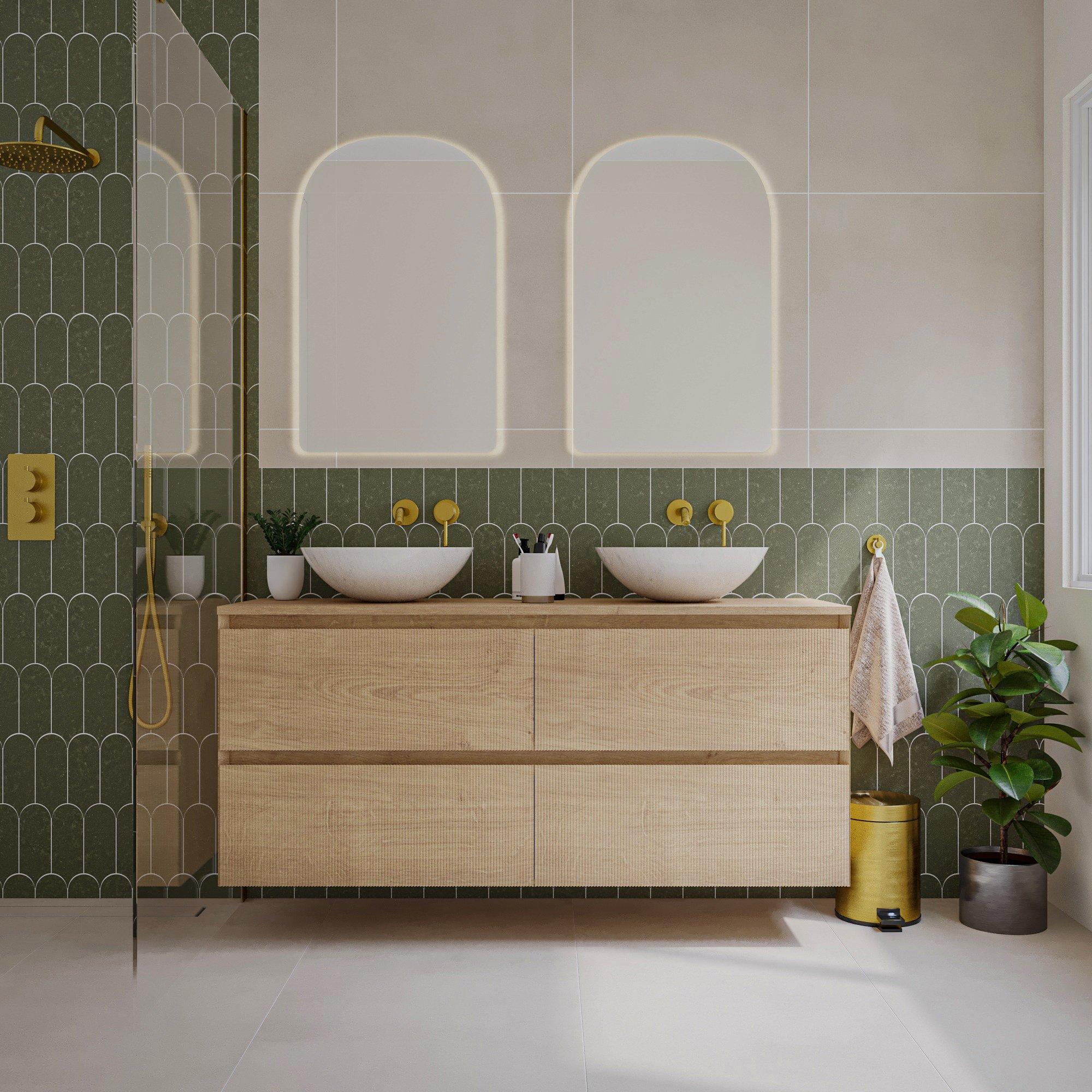 La finition en chêne naturel donne au meuble une apparence chaleureuse et authentique qui s'intègre parfaitement dans les salles de bains modernes comme classiques. Le panneau à rainures verticales ajoute un détail subtil qui donne un peu plus de caractère au meuble. Grâce au design sans poignées, le meuble reste épuré et minimaliste, ce qui crée une apparence calme et ordonnée. Vous profitez ainsi d'une salle de bains qui n'est pas seulement fonctionnelle, mais aussi un plaisir pour les yeux.
