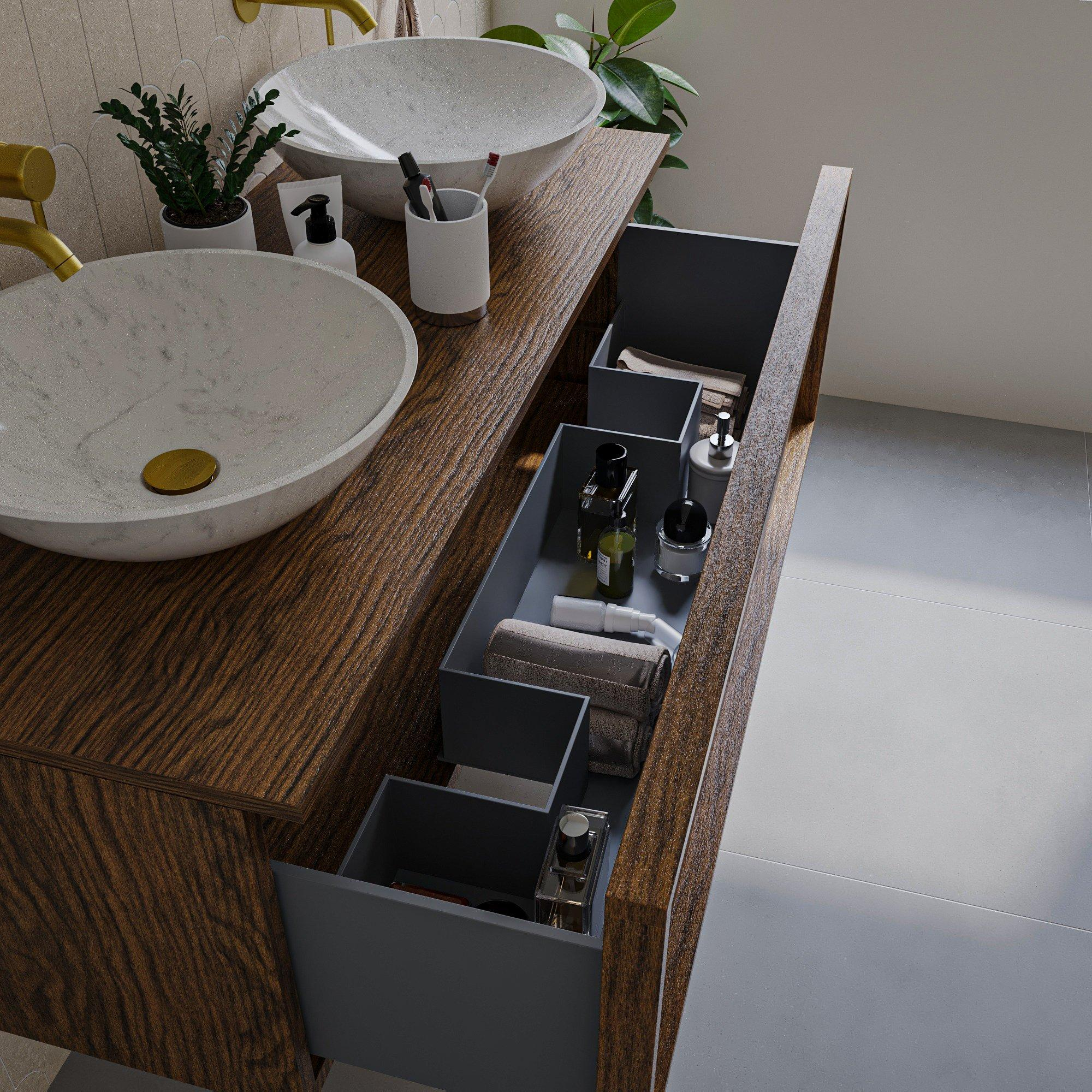 Transformez votre salle de bains avec un meuble qui n'est pas seulement fonctionnel, mais qui apporte aussi une ambiance chaleureuse et naturelle. Cet ensemble combine un design épuré avec l'aspect riche et authentique du chêne massif dans une magnifique couleur Walnut pure. Grâce aux dimensions généreuses de 120x45x40 cm, le meuble offre suffisamment d'espace de rangement sans prendre trop de place. Le tiroir sans poignée assure un look minimaliste et permet une ouverture et une fermeture douces et silencieuses, contribuant à une atmosphère détendue dans votre salle de bains. Le plan de toilette en bois ajoute une dimension supplémentaire à l'ensemble, faisant de votre salle de bains un lieu élégant et accueillant où vous commencez et terminez chaque jour avec plaisir.