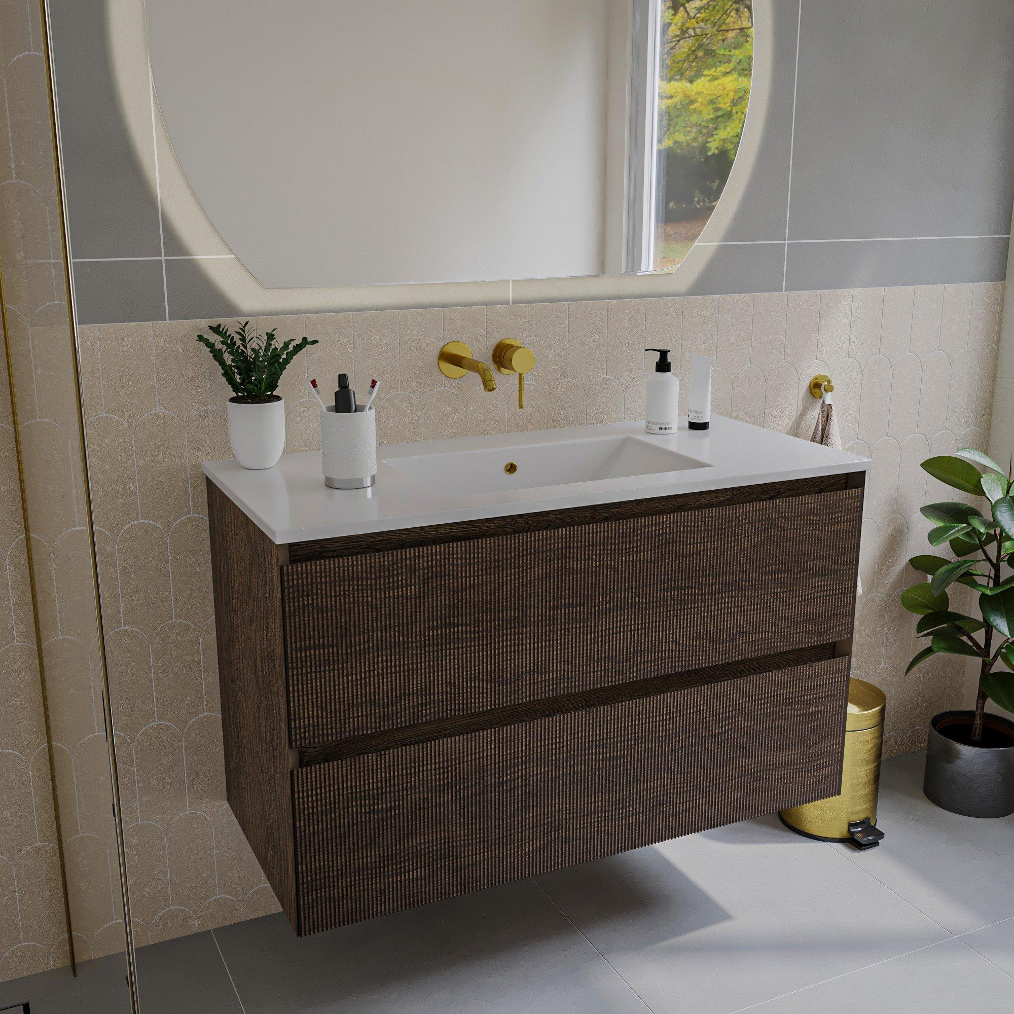 Transformez votre salle de bains avec cet ensemble meuble magnifique qui non seulement est élégant mais excelle aussi en fonctionnalité. Grâce au chaleureux chêne charcoal, le meuble offre un aspect naturel et moderne qui donne immédiatement à votre salle de bains une ambiance luxueuse et accueillante. Les dimensions compactes le rendent idéal pour les salles de bains petites comme grandes, tandis que l'agencement pratique avec deux tiroirs spacieux offre suffisamment d'espace de rangement. Les façades épurées sans poignées avec une subtile structure nervurée complètent l'ensemble et assurent un design intemporel qui s'adapte facilement à divers styles d'intérieur. Avec la vasque intégrée sans trous de robinet et un trop-plein pratique, vous bénéficiez d'une finition sans couture qui facilite le nettoyage et prévient les débordements d'eau. Ainsi, votre salle de bains devient un lieu où vous commencez et terminez chaque jour avec plaisir.
