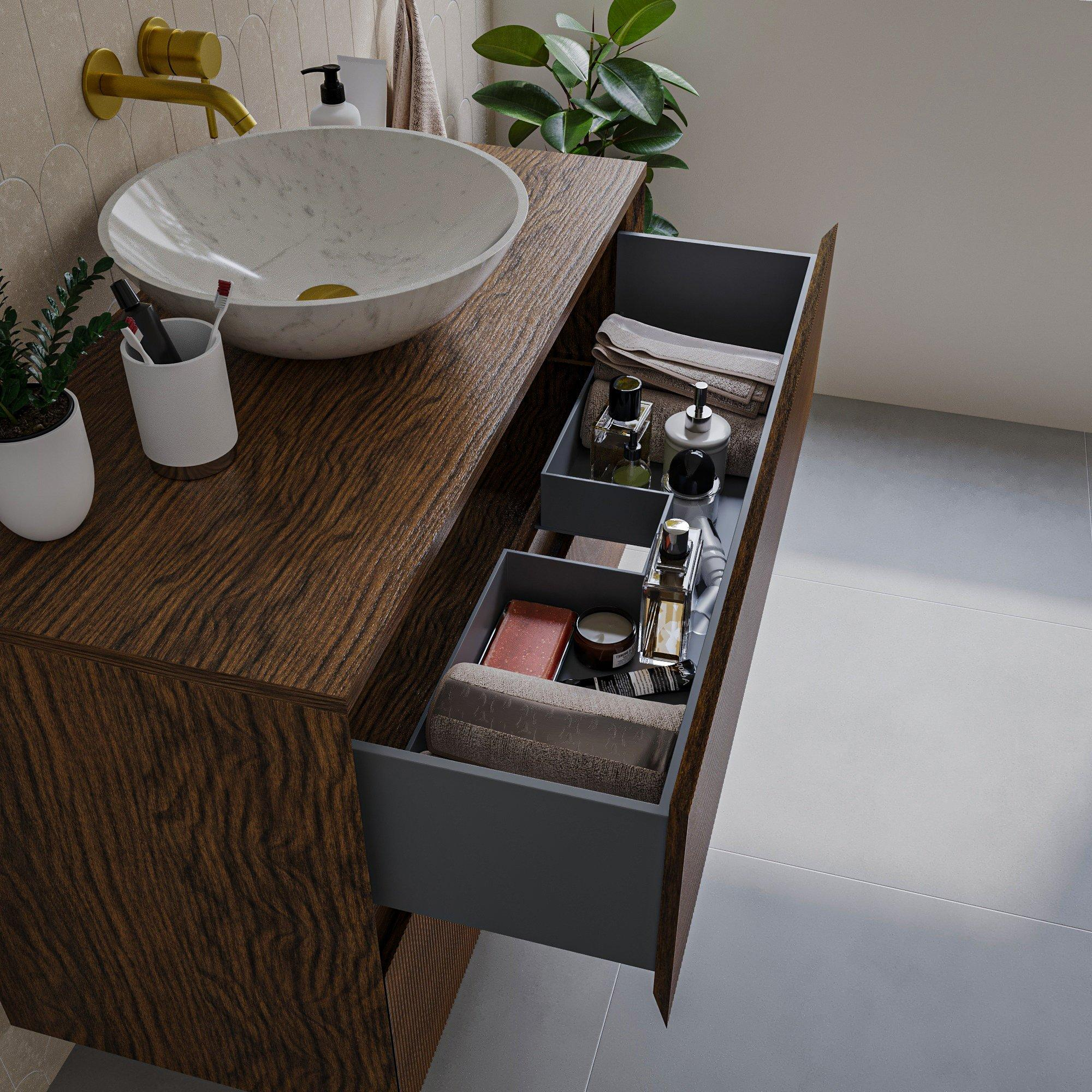 La couleur chaude Walnut pure et la façade cannelée avec des lignes verticales donnent à ce meuble une apparence unique qui s’intègre sans effort dans les salles de bains modernes et classiques. Le chêne massif dégage une élégance naturelle et assure un design intemporel qui ne se démode jamais. Grâce au design sans poignée, le meuble reste épuré et minimaliste, contribuant à une salle de bains calme et ordonnée. Vous profitez ainsi non seulement d’un beau meuble, mais aussi d’un espace qui dégage calme et style.
