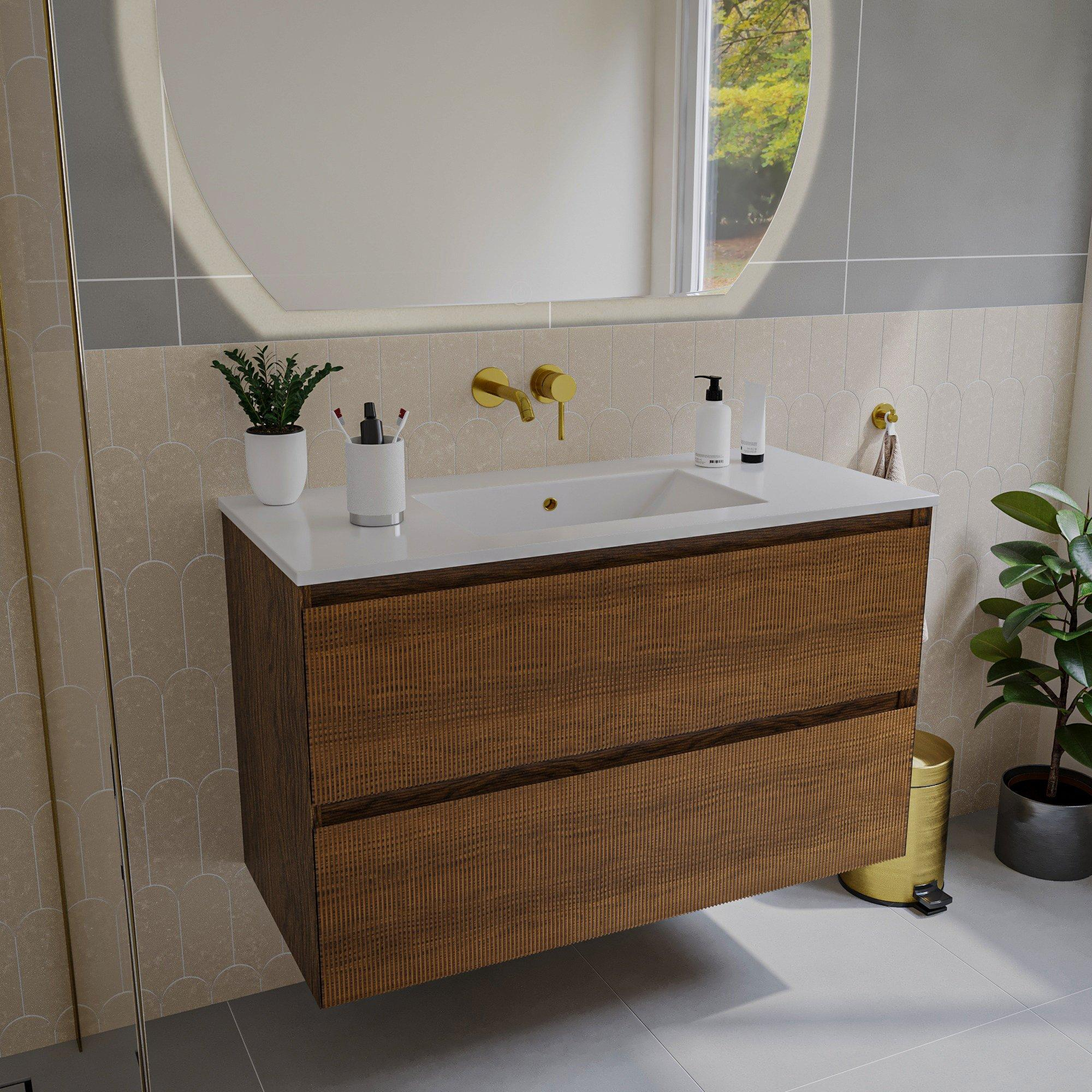 La couleur chaude Walnut pure et la façade cannelée avec des lignes verticales donnent à ce meuble une apparence unique qui s’intègre sans effort dans les salles de bains modernes et classiques. Le chêne massif dégage une élégance naturelle et assure un design intemporel qui ne se démode jamais. Grâce au design sans poignée, le meuble reste épuré et minimaliste, contribuant à une salle de bains calme et ordonnée. Vous profitez ainsi non seulement d’un beau meuble, mais aussi d’un espace qui dégage calme et style.
